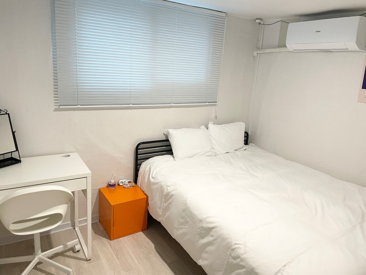 Located in 5~6 min From HongIk Sta & 7~9min From ShinChon Sat. 2min From Bus Sta(29 Bus lines)on the main Road By Walking. Very close for the action(Shopping,Touring & Enjoying Night Life) but Very quiet for a good night's rest.The room have a wide Double bed,Private Bathroom, Private kitchen, Washing machine. Hi-Speed Internet/WiFi, Cable TV having 280Channels including English Speaking, A/C,Floor-Heating&Hot water Boiler Sys. There is a tent resting including smoking table