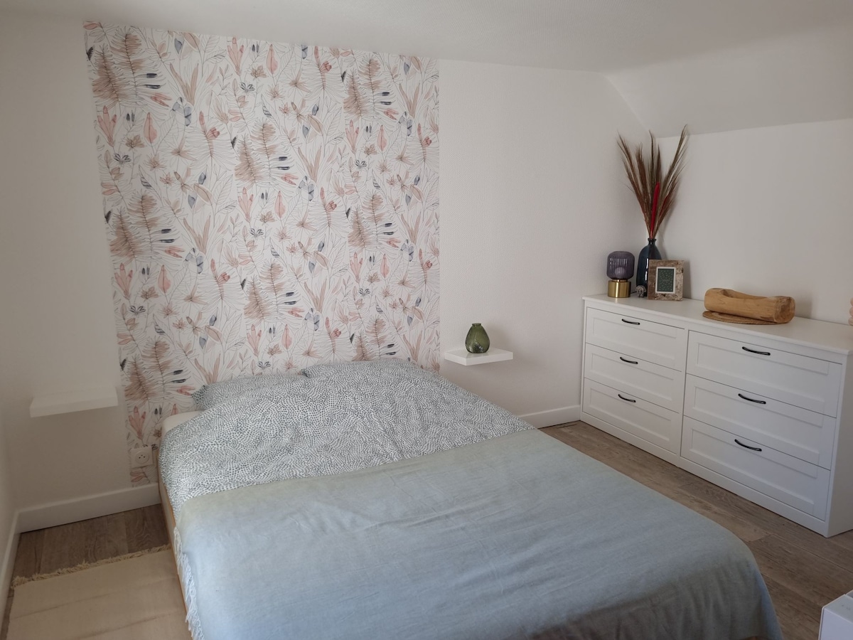 1 chambre avec lit de 160cm ,le 2ème couchage 1 canapé 140cm avec matelas 19 cm d épaisseur dans la pièce de vie. 1 pièce de vie de 50m2 avec cuisine ouverte. salle d eau avec grande douche. cour avec salon de jardin et balançoires à votre disposition. Garage et jardin clos de murs située à 300m des bords de l Yonne et du centre ville. les propriétaires sont dans la même cour