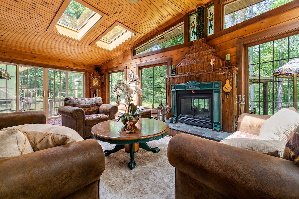 please note: WE DO NOT PROVIDE WIFI. Old world craftsmanship and charm with incredible 50' diameter stone courtyard with huge fireplace, satellite bar, swinging chairs, private deck with custom grill. 2 person hot tub set under a stunning mature cluster of white paper birches with ambient lighting for an amazing nitetime experience. This is a true post and beam cabin. when you see the palm trees you have arrived. read the reviews!