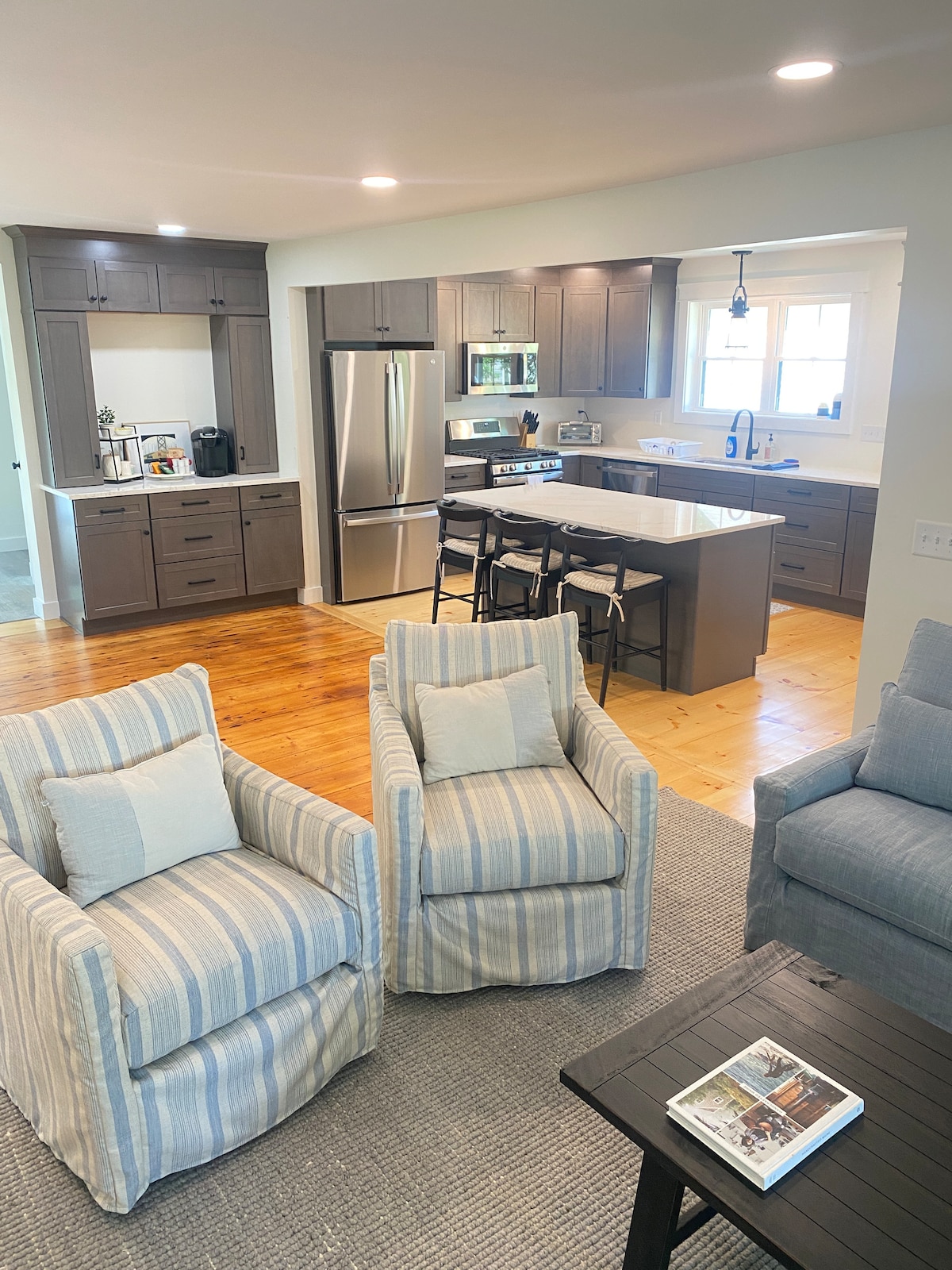 Come relax in the guest suite of our new modern farmhouse, one mile from Cape Porpoise's village town centre in Kennebunkport. Enjoy a private entrance and outdoor seating space/ fire pit overlooking a wooded lot. The 1000 sq. ft. space is bright and roomy. It has a king-sized bed with tv, kitchenette, office area and a 50 inch smart tv in the comfy living room. Walk outside our home and find 27 miles of interconnecting conservation land trails.