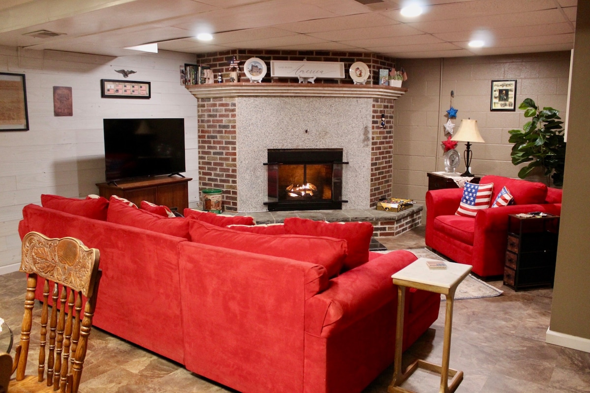 Our well-kept, 5000 sq ft vacation home is located in a safe and quiet neighborhood in York, P.A. Bedroom layout: 1st bedroom on FIRST FLOOR-Queen bed 2nd bedroom- Queen bed(Jack and Jill bathroom shared with 3rd bedroom) 3rd bedroom-Twin bunk beds 4th bedroom w/en-suite bathroom-Queen bed 5th bedroom w/en-suite bathroom-King bed and crib BASEMENT: Queen bed w/full bath *There is a tv in every bedroom.