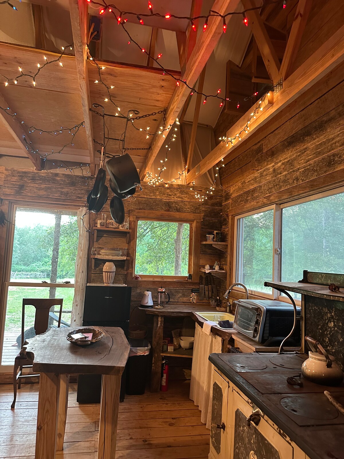 Come glamp with us a short drive from downtown Charlotte at Fawn and Fern Hideaway sitting on 5 wooded acres with a private road and parking. We feed the graceful deer community in hopes they visit you. Enjoy your own kitchenette with sink, mini fridge, k-cup and microwave. Your glamping includes a toilet, electric fireplace, and AC unit. It sleeps 4 with a queen and bunk bed. Use the charcoal grill and fire pit or outdoor dining bistro and picnic tables glowing by whimsical hanging lights.