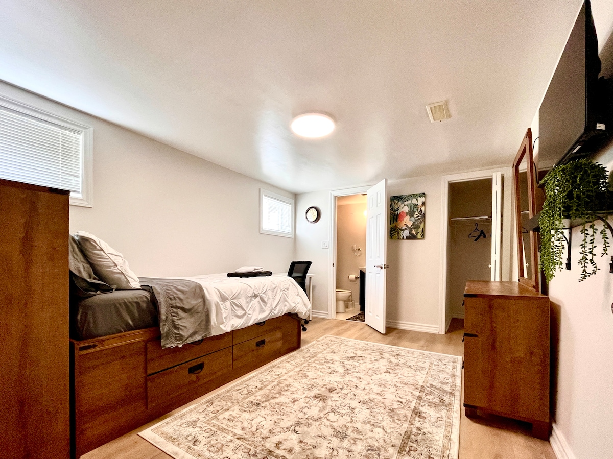 You will be close to everything when you stay at this centrally located place. 5 minute Walk to Public Transit, Walmart and other shopping plazas. Our house is located on the north side of the city, in a quiet and safe suburb. We are 14km from the downtown toronto, and a 25 min drive from Toronto Pearson Airport. Cozy private open concept space. Private entrance. Great for couples, or small family.
