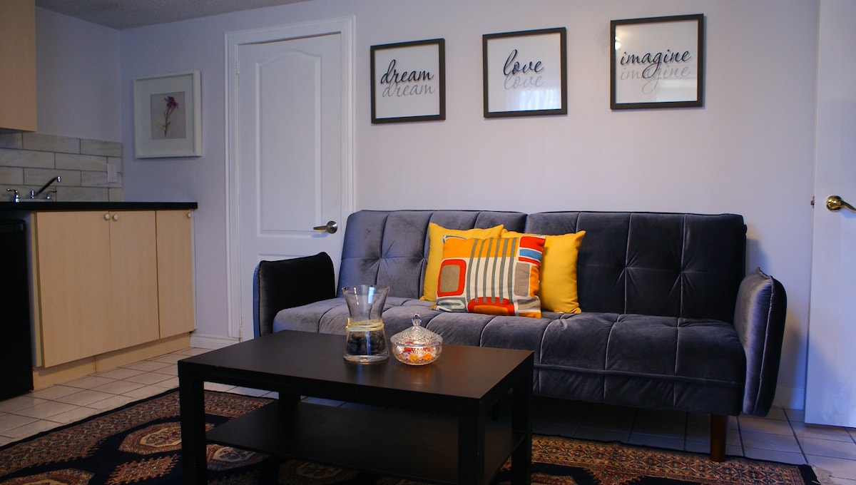 Our cozy entire basement unit offers a spacious living room with 50 inches UHD smart TV and a sofa bed. Free Gigabit WIFI. Two bedrooms with queen size beds and large closets. Dining table with four chairs. Dedicated workspace with a desk and chair. Equipped kitchen with cooktop, Fridge, Air fryer oven and Microwave, Private laundry with Washer and Dryer. Free street parking (Drive way can be used for winter overnight parking)