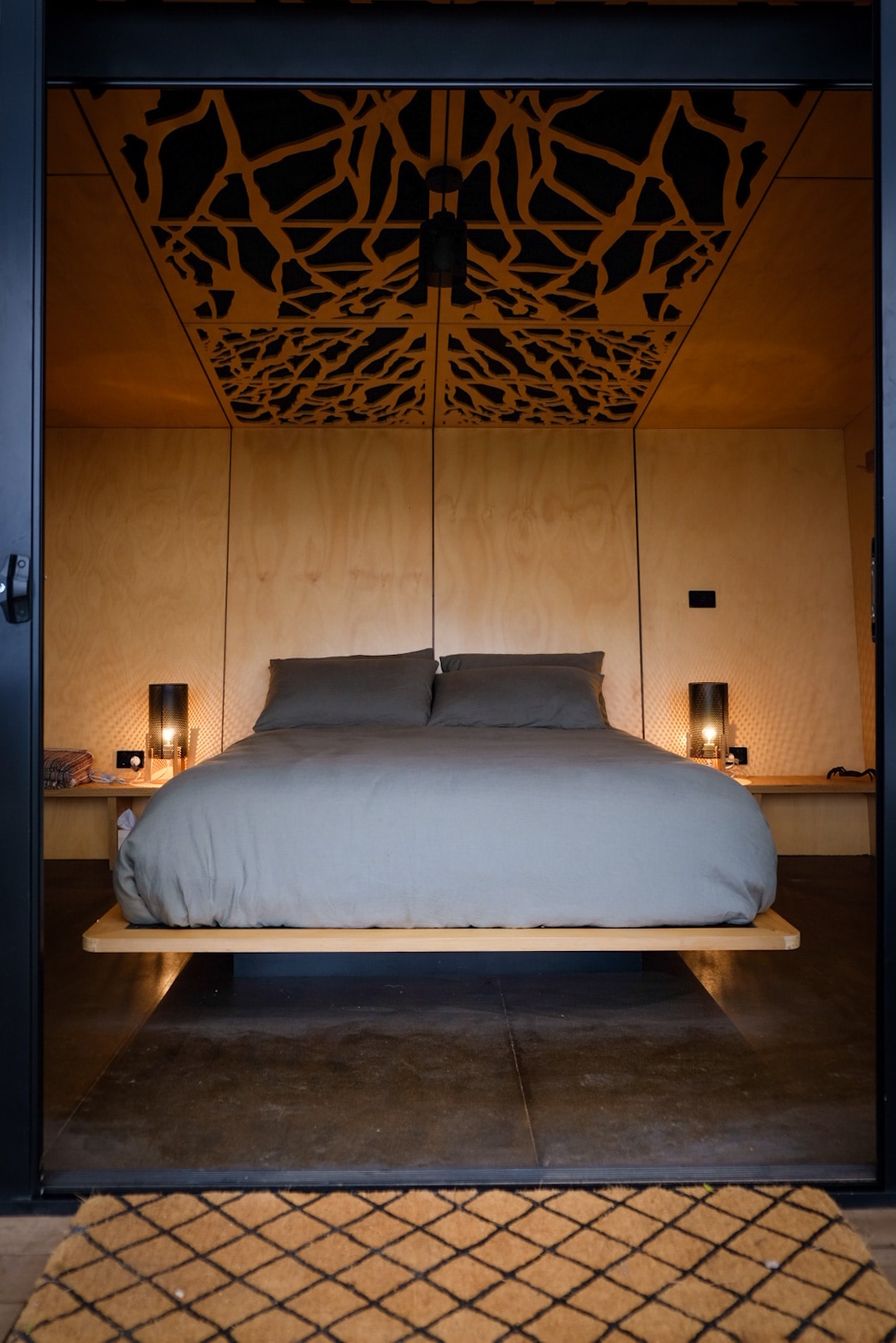 The pod was designed by Troppo Architects and built by Oscar Builders . In recognition of the thought, design approach and build quality, the Klein Pod has been furnished sparsely but with quality and purposeful use in mind. The single unit has a small kitchenette, lounge area, queen bed and combustion heater. Out on the deck you can relax on the day bed. The shower is outside behind a rustic privacy screen.