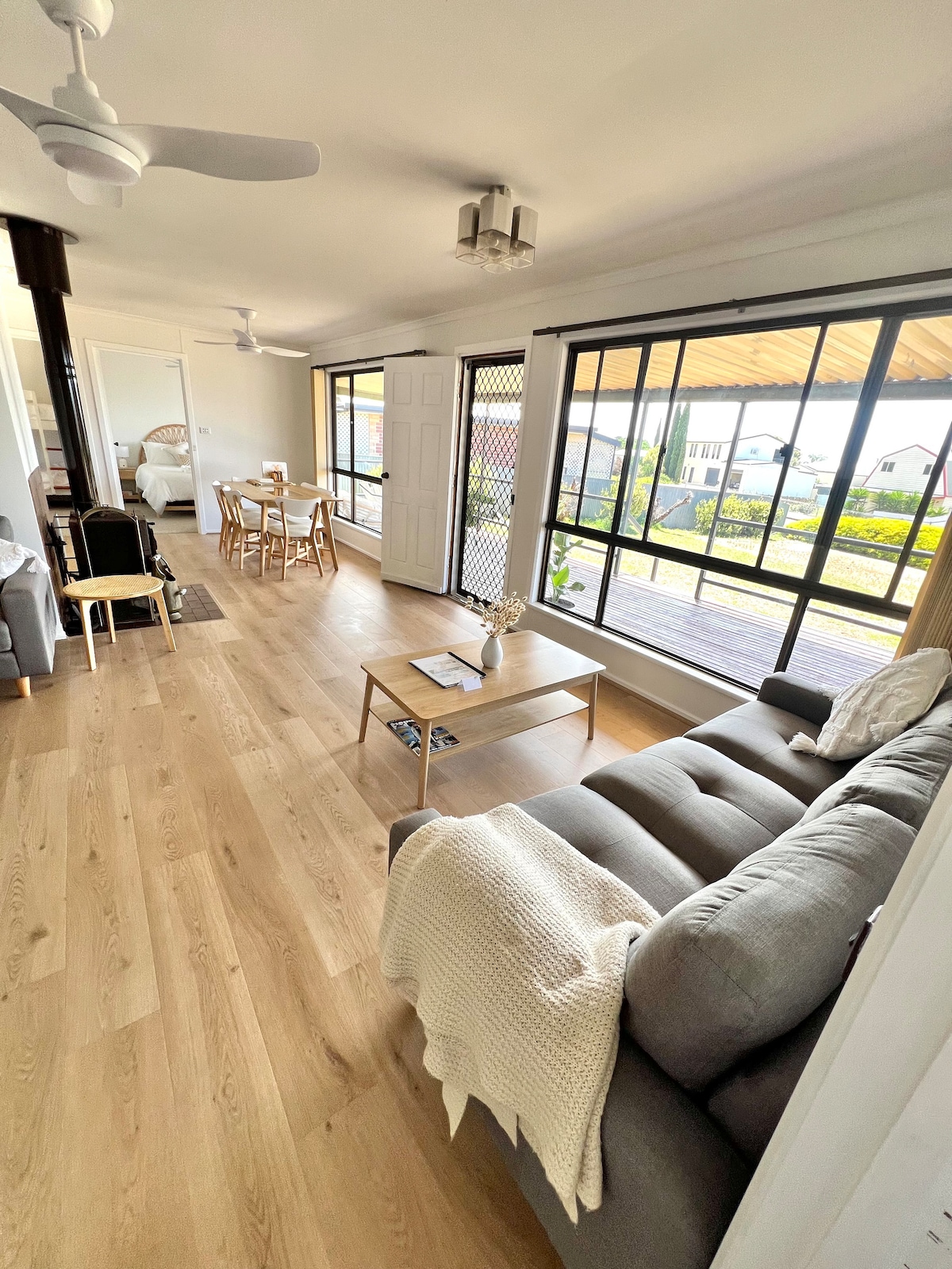 Are you looking to escape everyday life? Look no further than Hardwicke Hideaway! Gorgeous, freshly renovated, modern two-bedroom house that is a short walk to the beach. Relax in front of the fireplace (BYO wood) and admire our original antique fishing reel wall. Hardwicke Hideaway has a fabulous outdoor deck, where you can cook up a storm on the BBQ, dine al fresco, or just chill and read a book on the outdoor lounge setting. Both bedrooms are well-appointed with high-quality beds and linen.