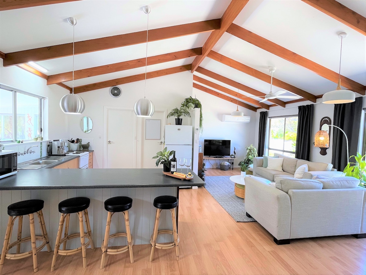 The Osprey is a freshly renovated one bedroom getaway for couples. A king sized bed with plush Sheet Society linen and soft furnishings for a restful, relaxing nights sleep. Enjoy relaxing amongst my large and ever changing collection of indoor plants or freshen up in the new bathroom and head outside to relax on the daybed with a wine, a book or kick back and watch the local birdlife frolic in the bird baths in the recently planted native garden. Enjoy the new outdoor kitchen facilities