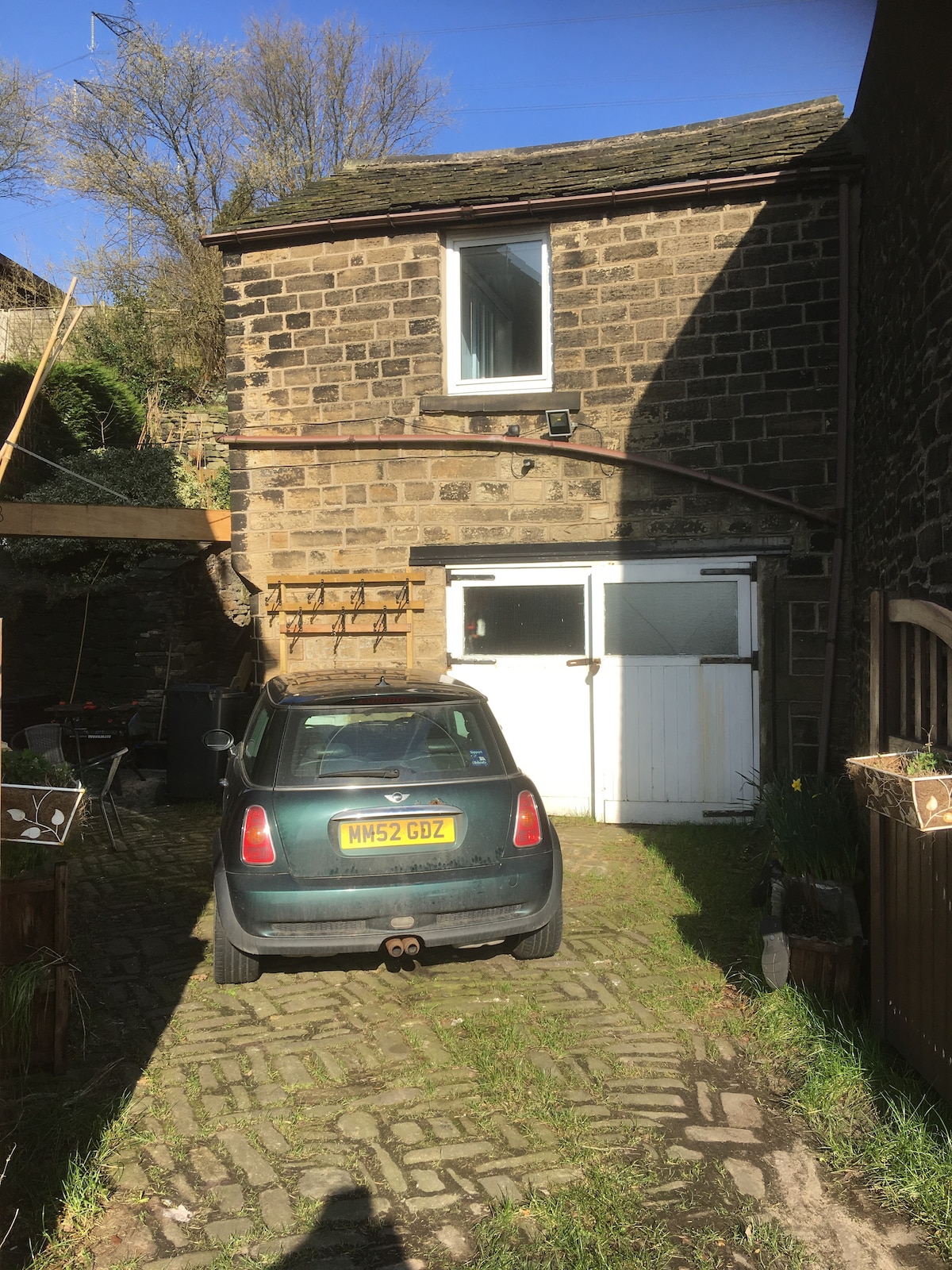 Blue/white decor. Includes tea/coffee/milk/sugar. Crockery, cutlery, towels, microwave, electric pan hob, electric mini oven and grill, fridge/freezer, toaster, kettle, cleaners & towels. Iron/ironing table, cloths rack/hair dryer, Aircon, TV with DVD.WiFi. D/bed, table+2-chairs. Sofa bed. Patio garden & planted. Outdoor table, chairs and umbrella. Its on the edge of Peak National Park with walks, cycle tracks and access to local rail station. Pub food nearby and take-aways nearby.