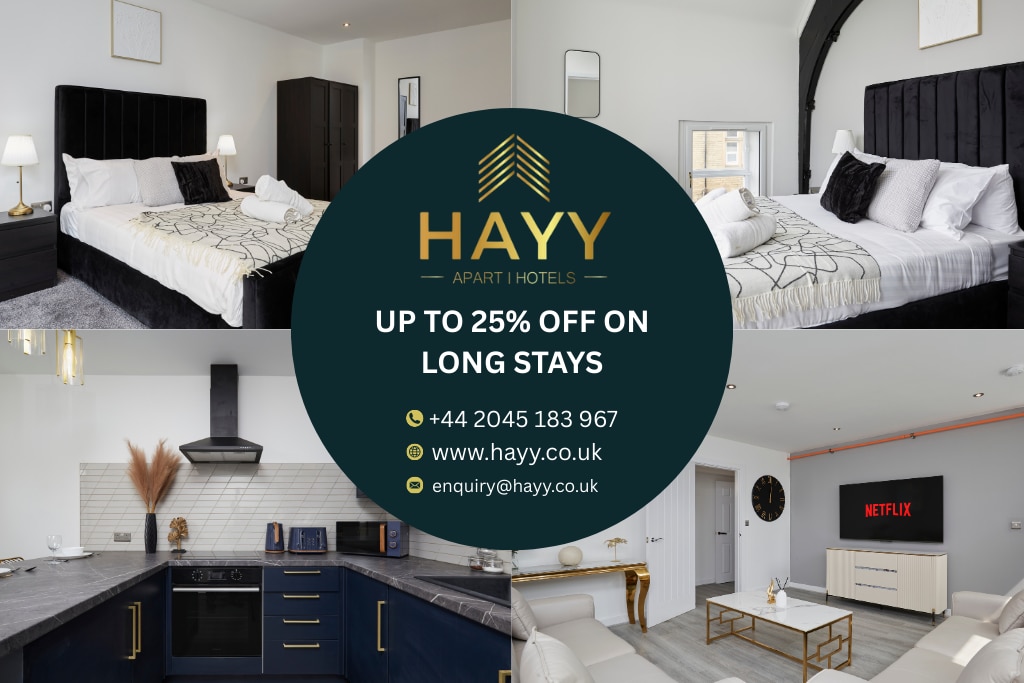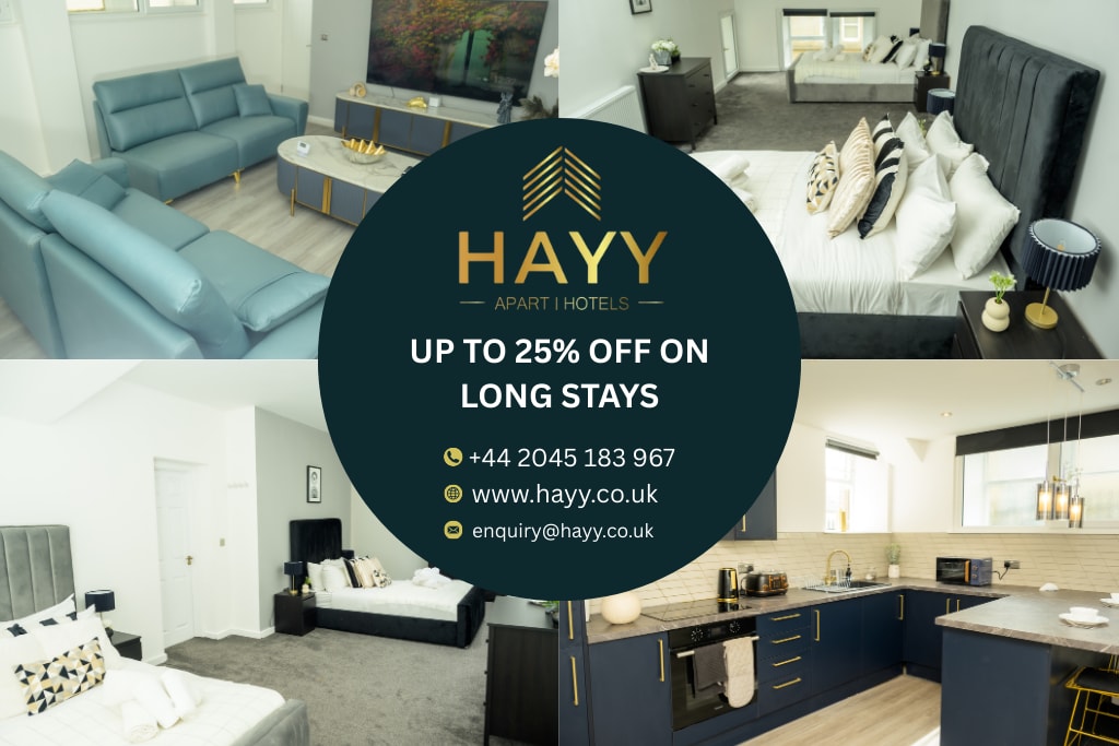 Hayy LivingTownhouse Edition – 2-Bedroom Apartment 🛏️ 2 bedrooms with fresh bed linen & storage 🛁 Bath + shower, shampoo, conditioner, toiletries 🍳 Fully equipped kitchen (fridge, oven, microwave, freezer, kettle, toaster, dining table, coffee) 💻 Dedicated workspace + fast WiFi & TV 🧺 Washing machine, iron, drying rack 🅿️ Free on-site parking, private entrance, safety alarms