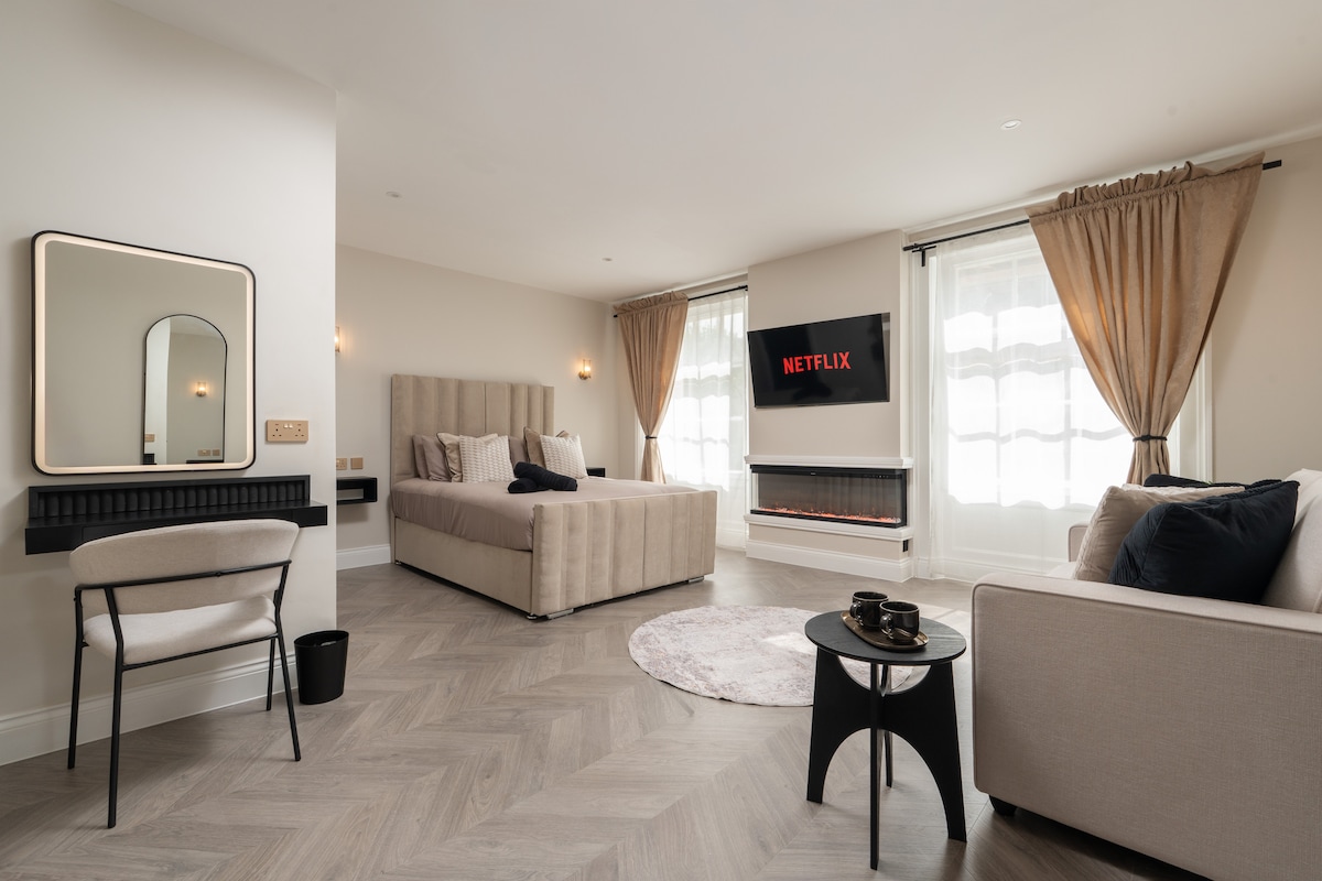 Stylish one-bedroom apartment at Cambridge House, perfect for families, groups of friends and guests with a well-behaved dog. Features a king-size bedroom with en-suite, separate living room with sofa bed, dining area, and compact kitchenette with fridge, microwave, kettle, and coffee machine. Located in central Windermere, just steps from the train station and a short stroll to the lake. Dog-friendly (additional fee applies).