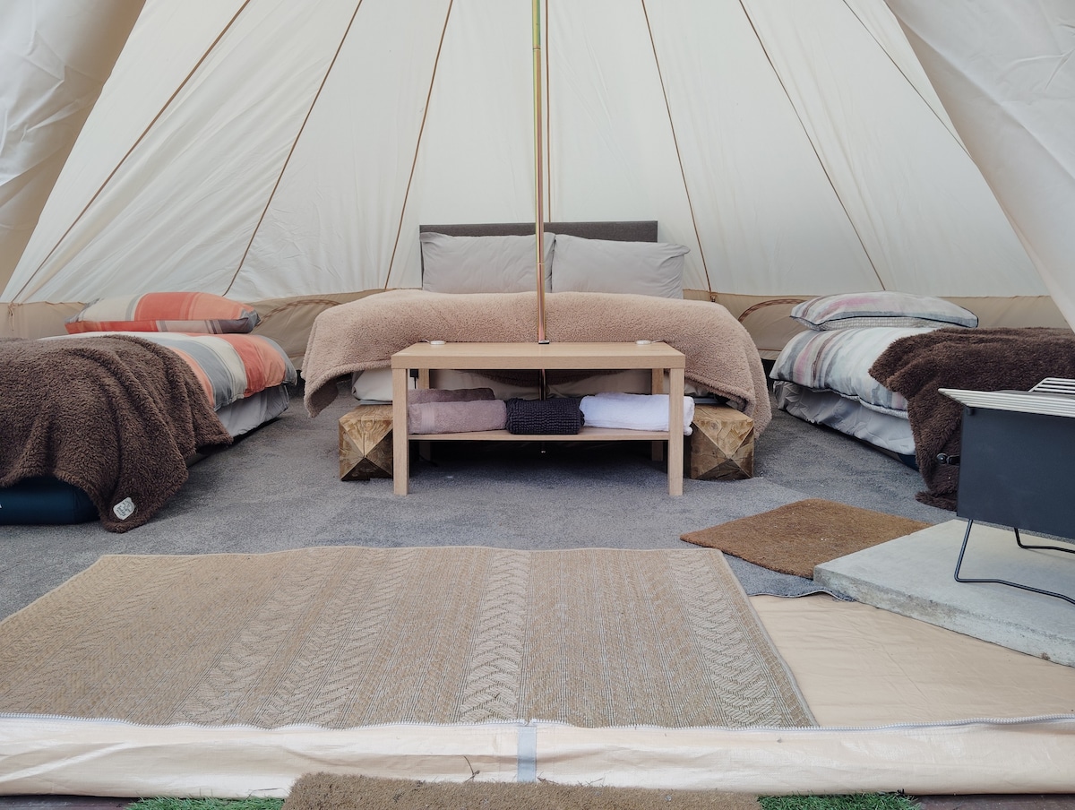 Daisy Lane Glamping ( York ) with log burner. 5 Meta Bell Tent. 1, real 4,6 bed. 2, single kids camp beds only.( Anymore than 2 adults you will pay a extra adult charge £25 pp on arrival) There are goats, chicken's and little ted the dog. A lovely out door gas cooking area under the gazebo. Your owen private corner, Fire pit, BBQ, phone charging point. We are a off grid glamping site with compost toilets and lovely hot showers. 3 miles from York city centre on a great bus route.