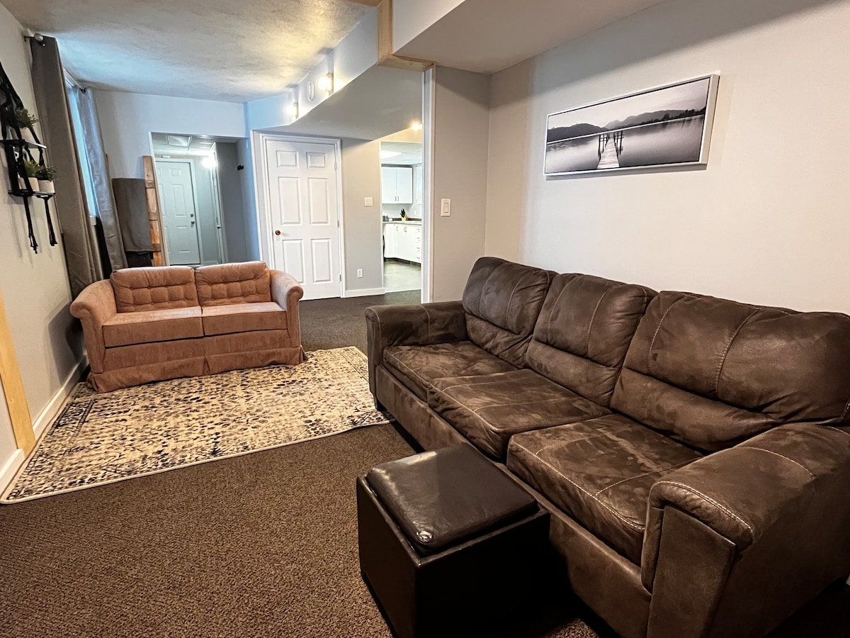 Centrally located suite on back side of Main Street, Esterhazy. 2 bedrooms, both with Queen beds and all linens provided. Equipped kitchen, pots/pans, dishes, microwave, coffee makers. 4 piece bath with ceramic tile flooring, towels, shampoo/conditioner. In suite laundry, detergent/dryer sheets. Living room with flat screen smart TV, couch, loveseat and fireplace, free wifi.