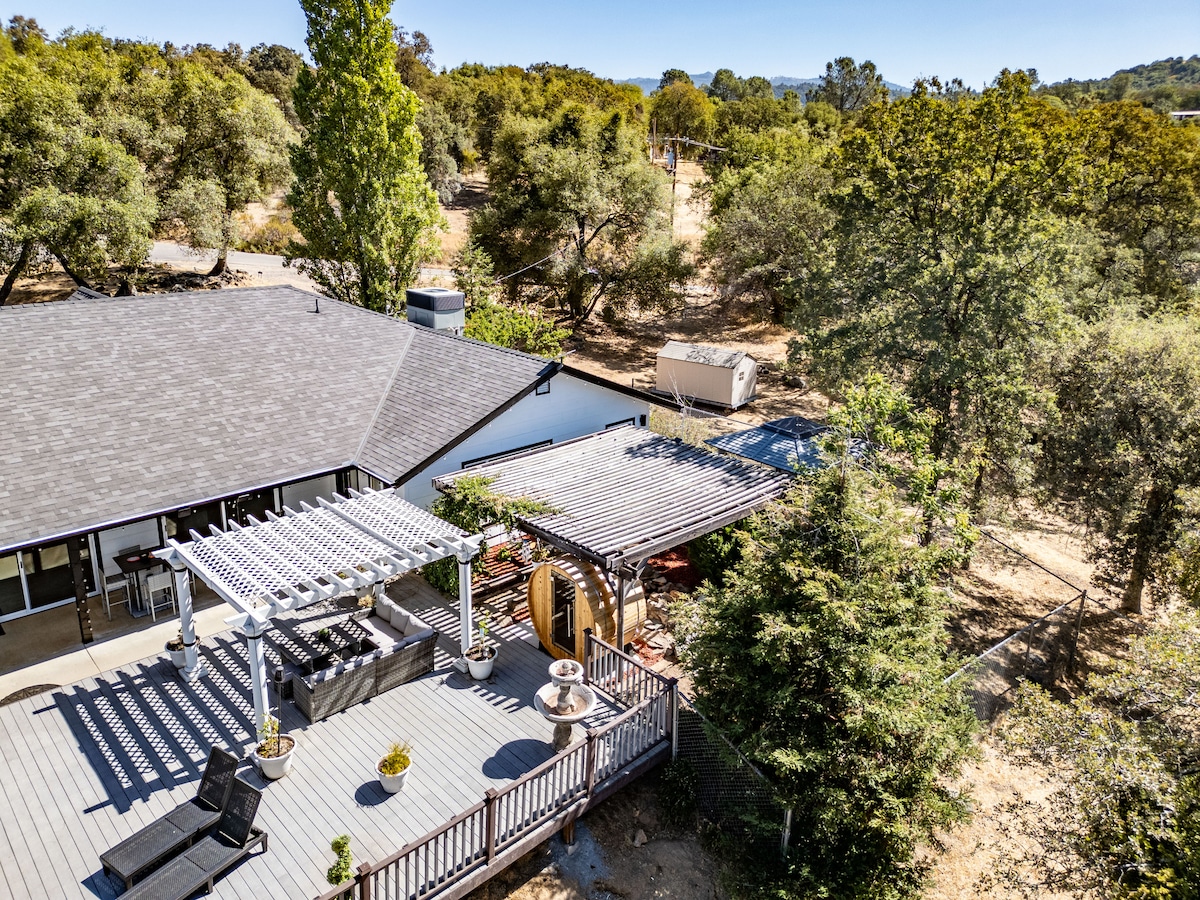 5 🌟 Hilltop residence with spectacular Sierra views 🏔️ Perched atop a private hill on 4 acres, this 1800 sqft home boasts breathtaking views with a stylish and spacious interior, effortlessly blending modern luxury with untouched natural beauty. Curl up on the patio swing as you watch the sunrise over the hills! Just 45 min to Yosemite and 7 min to downtown Mariposa, the home is perfect for a family trip but cozy enough for a couples getaway. Come enjoy the views, silence, and seclusion!