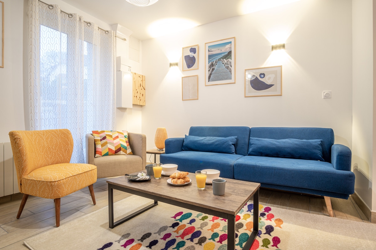 Très bel appartement de charme pouvant accueillir 2 adultes et 1 bébé (jusqu'à 1 ans) vous serez charmé par sa décoration, mélange de matériaux, chic, vintage et bord de mer… Tout juste rénové, vous pourrez profiter d'une très belle terrasse en bois surélevée exposée plein sud pour vous détendre et profiter des belles journées. Idéalement situé près du port, de la plage, du centre ville. Option : Accès à l'espace Sauna aux pierres volcaniques, jacuzzi aux divers massages à une température de 37°