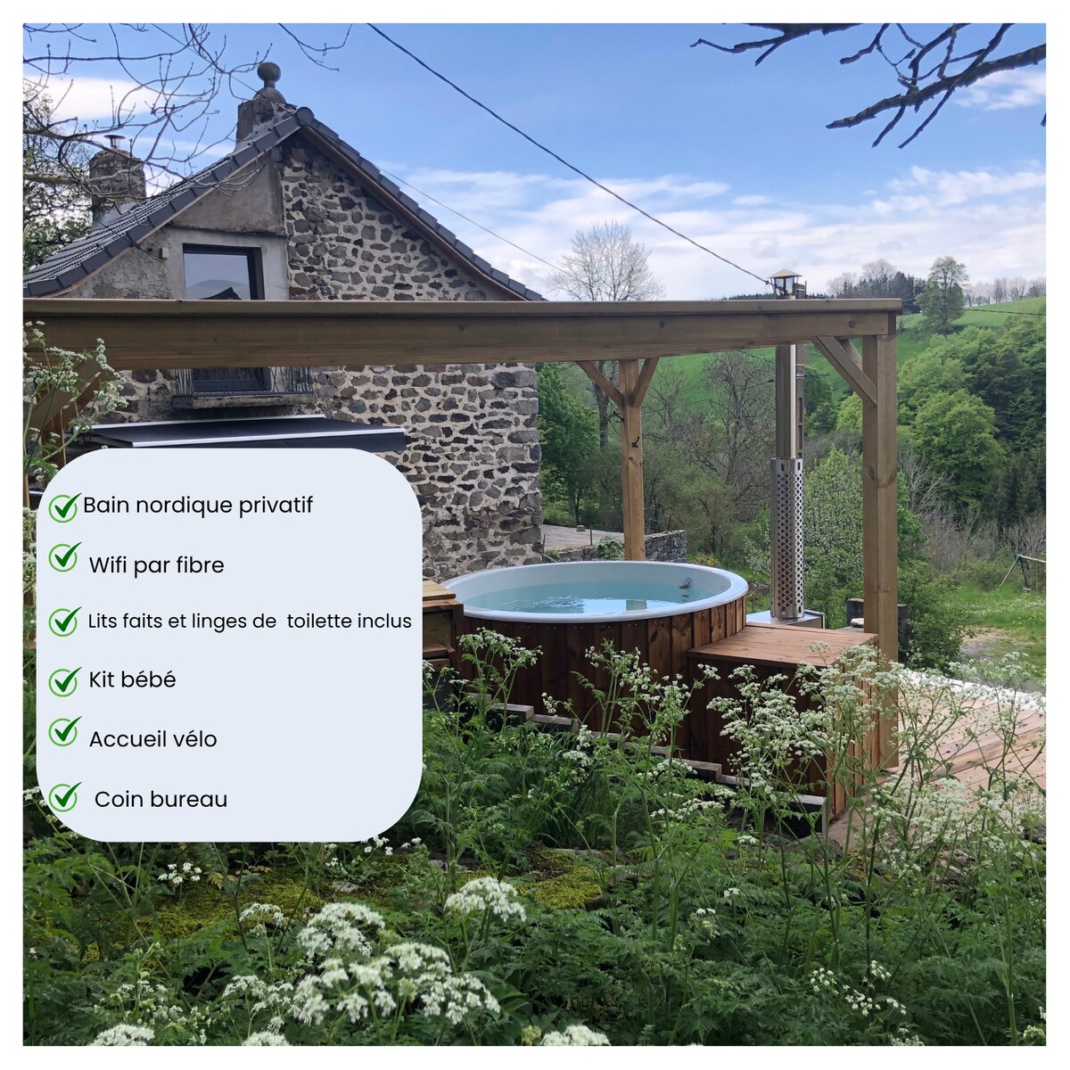 Besoin de déconnecter dans la nature, de confort douillet au coin du feu ? Cette ancienne petite chaumière en pierre et bois, rustique et cosy est faite pour vous ! Le bain nordique jacuzzi privatif et le sauna panoramique est à votre disposition tout au long de votre séjour. Avec sa cheminée, sa terrasse de lauzes, son calme : l'endroit idéal pour faire une vraie pause été comme hiver. Cocooning en amoureux, activités nature en forêt et sur les plateaux auvergnats ! Time to relax !