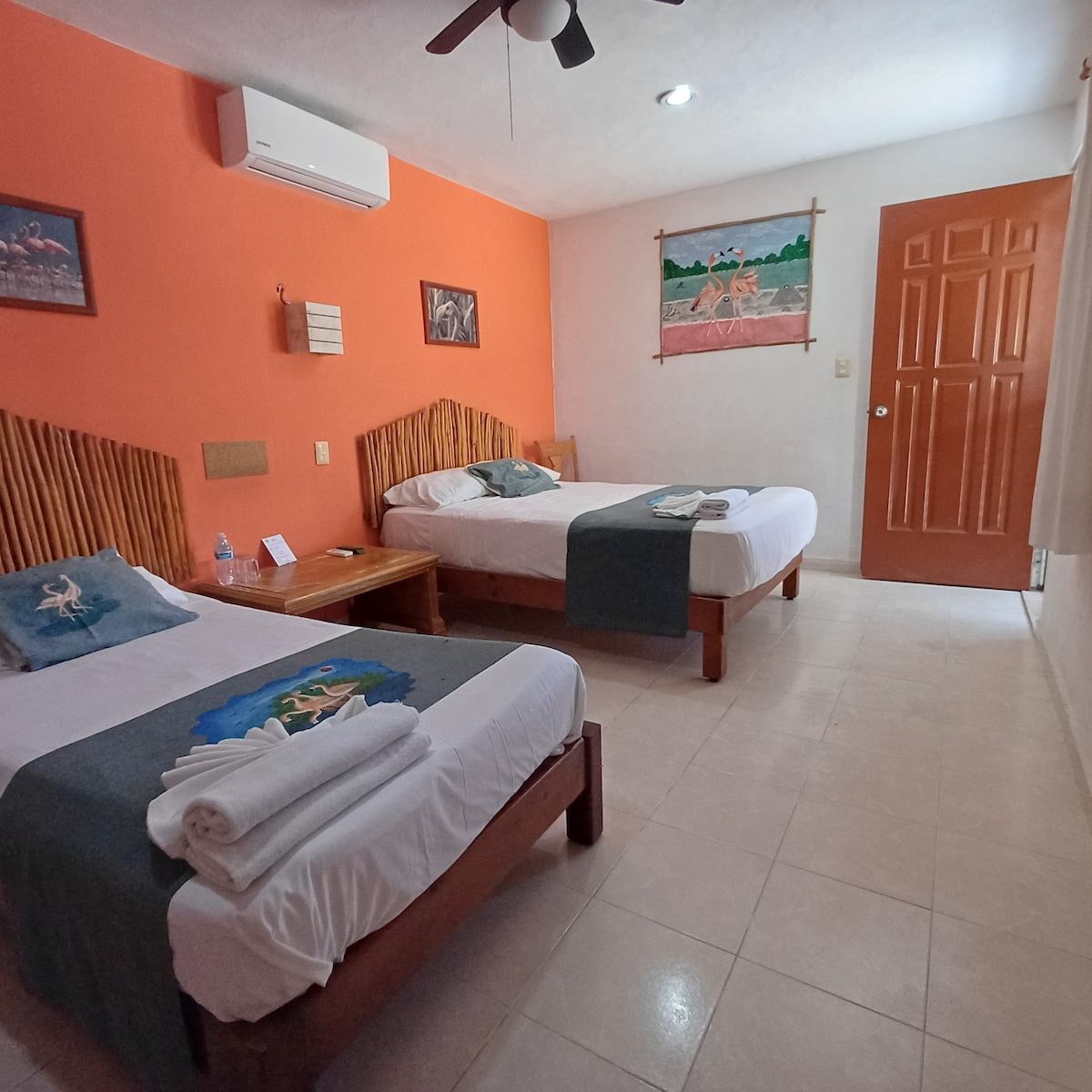 Large beachfront retreat, literally one step from the beautiful Gulf of Mexico beaches. This listing is for one bedroom with private bath King sized bed. Air conditioning and TV. There are two other identical bedrooms available at the same price each. Private pool for guest use only. Rooftop cocktail pool for viewing our stunning sunsets. Coffee and bottled water provided. Stocked kitchenette . Spanish spoken. No small children due to open pool area.