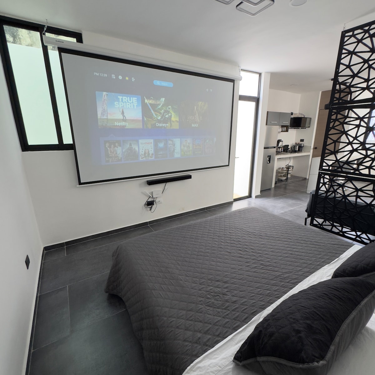 Estudio privado en zona tranquila y segura de Mérida, diseñado para descansar con estilo. Disfruta una auténtica experiencia de cine en casa con proyector de 120” y sonido envolvente. Cama King, A/C potente y WiFi rápido para trabajar o relajarte con total comodidad. Cocina equipada, cafetera Nespresso y estacionamiento privado. Ubicación estratégica cerca de Plaza Altabrisa, restaurantes y servicios. Ideal para estancias largas o viajeros que buscan confort, privacidad y calidad.