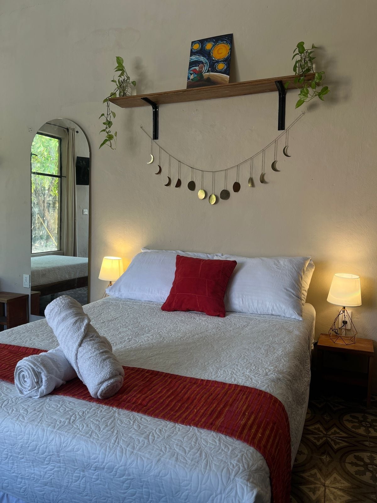 Departamento tipo Loft, con amplios espacios, puertas de madera, techos altos, muebles de madera y construcción de mampostería. Cuenta con dos camas matrimoniales, un baño, cocina, escritorio y una pequeña terraza. Se encuentra a 15min caminando de la plaza principal del centro de Mérida, el transporte público pasa a una calle y el Uber cobra aproximadamente $30 por llevarlos al centro.