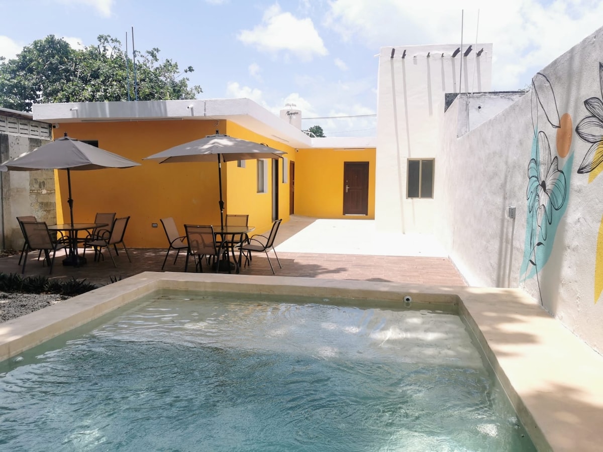 Small and cozy villa with contemporary Mexican design, with everything you need for long and short stays, ideal for resting or home office. Equipped with a full kitchen, living room, bathroom with hot water, air conditioning, fans, high-speed Wi-Fi, private patio with trees, swimming pool and shared laundry within the facilities. Excellent location, a few steps from Paseo Montejo near Walmart, banks, bars and restaurants.