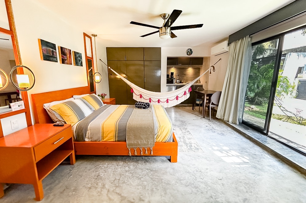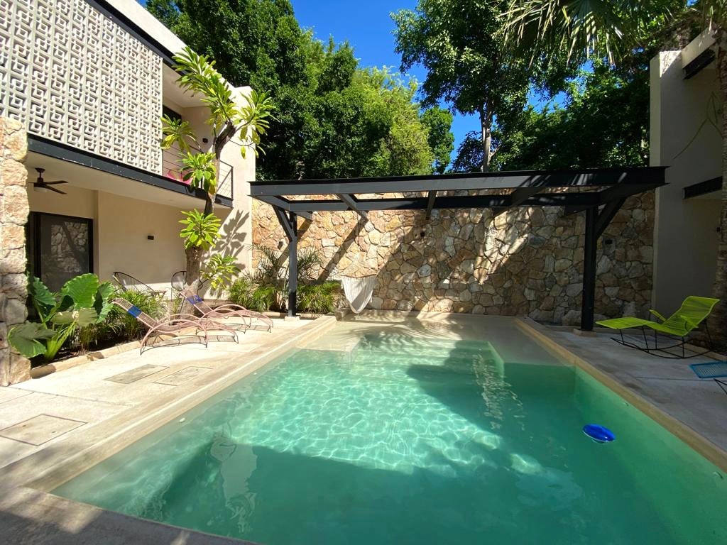 "Beautiful Private Suite filled with natural light. The clarity & simplicity of the space will make you feel peaceful, fresh & relaxed. The floor plan is an open concept and perfect for: relaxing, lounging, napping, with the view of the pool. A very convenient location right next door from the Parque La Plancha, 47th Gastronomic Corridor and walking distance to the Paseo de Montejo with the best coffee shops, restaurants, markets and other trendy places close to our beautiful Centro Histórico"