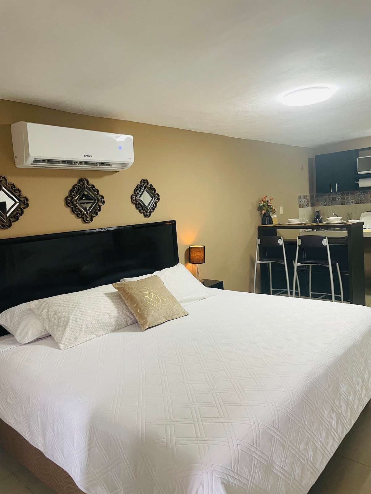 Departamento moderno en Altabrisa, ideal para familias pequeñas hasta 3 personas, la cual cuenta con: Habitación con una 1 cama matrimonial y 1 cama individual, Smart TV para que disfrutes de tus series y películas favoritas. Una pequeña terraza privada Incluye: Baño completo con agua caliente. Cocina totalmente equipada para preparar tus comidas favoritas. Sala y comedor climatizados Garaje Internet de alta velocidad, ideal para trabajar o disfrutar de streaming Ruta de transporte urbano