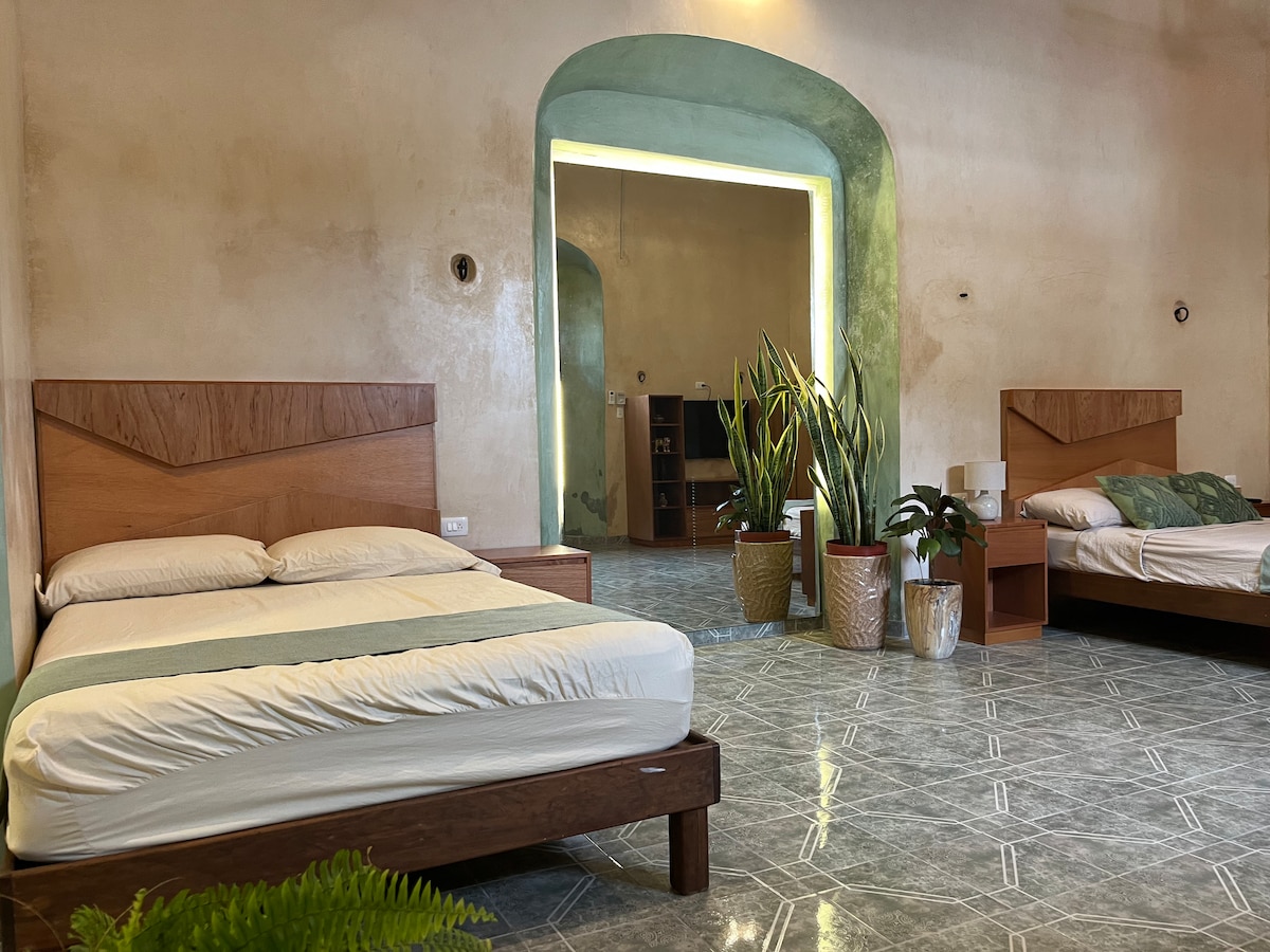 Ubicado en un lugar céntrico, te ofrecemos hospedarte en un oasis de calma y tranquilidad, seguro y cómodo . Ideal para turismo, negocios o salud, estamos a 6 km del aeropuerto, 4 km de la estación ADO, 1 km del Hospital Ohran y la Clínica Mérida, 2 km del Centro Internacional de Convenciones y 5 km del Centro de Convenciones Siglo XXI. En un auténtico barrio yucateco, frente a Col. Centro y 33 km de Puerto Progreso, con fácil acceso al centro de la ciudad Sisal, Celestún, Uxmal y cenotes.