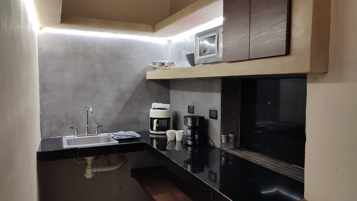 Depto T'HO 13, sencillamente acogedor, ubicado en el tradicional barrio de itzimna, con una conectividad única, con estilo practico y funcional, cuenta con sala ,comedor ,cocina, bar, una habitación con aire acondicionado, área de trabajo con potente wifi, televisión con cable , closet; un baño completo y un patio que invita a la relajación , ya que cuenta con sala de estar con música , terraza ,asador, piscina tipo jacuzzi y hamaca.