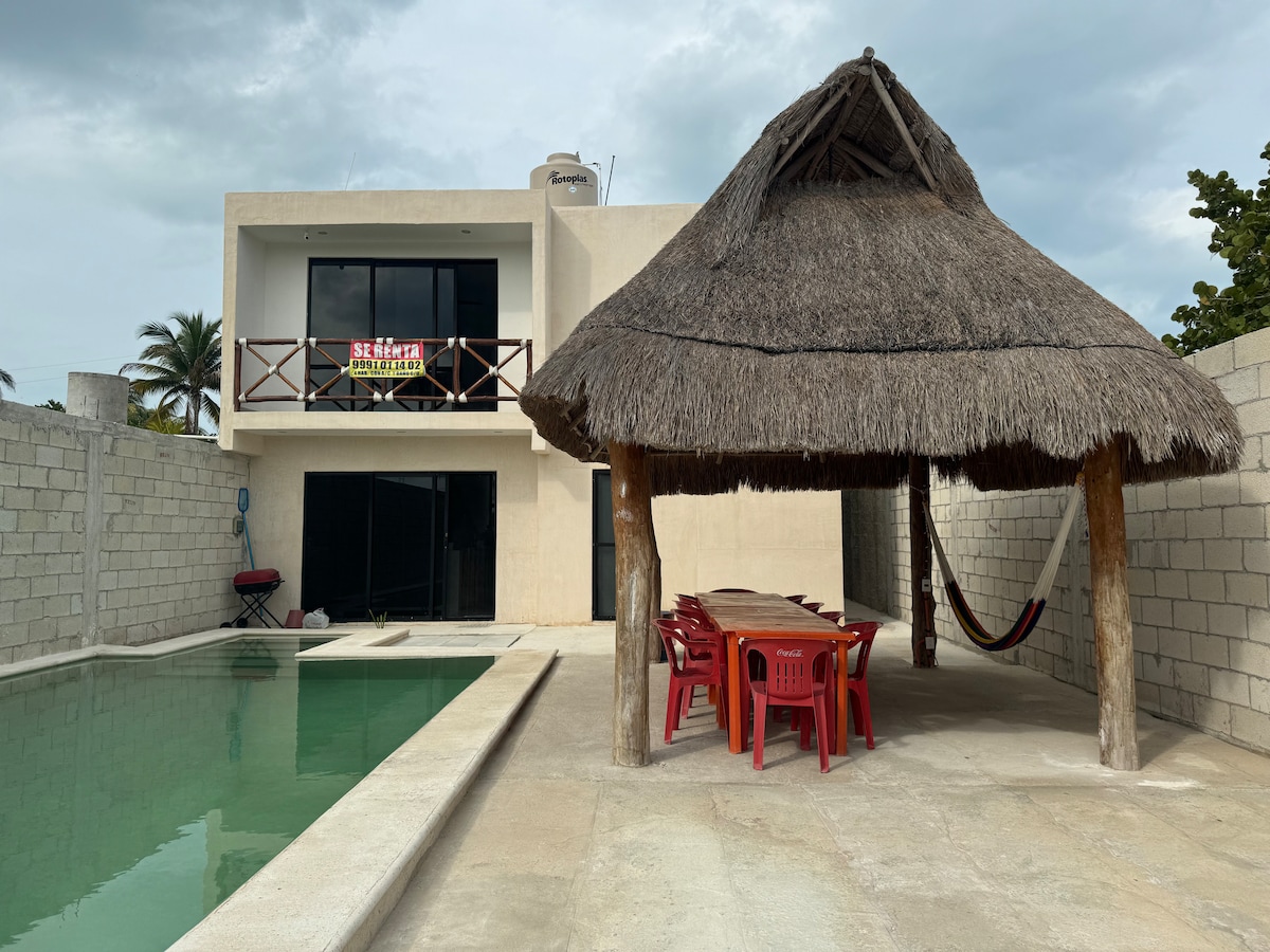 Hermosa Casa Departamento a 100m de la playa en Telchac Puerto, Yucatán con PISCINA Es un solo espacio donde tienes todas las comodidades para tu estancia tal como: Cocina: estufa eléctrica, microondas, Frigobar, licuadora, cafetera, utensilios, meseta desayunador - Baño: Agua caliente, shampoo, tollas... - Cuenta con cama matrimonial, Sofá cama, dos hamacas, silla hamaca, Comedor para 4 personas. (No tiene cuartos). - Cuenta con estacionamiento máximo 2 coches. - El patio esta limitado.