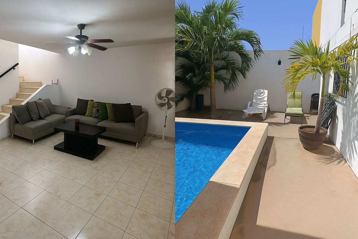 Casa antigua remodelada con una combinación de lo antiguo con lo moderno, está en una colonia tradicional y tranquila, se encuentra entre la avenida cupules y circuito colonia, dos de las principales avenidas de la ciudad, cerca del centro de la ciudad, de paseo de Montejo, donde se puede descansar con total tranquilidad y disfrutar la estancia, cuenta con un amplio jardín y una piscina, cuenta con internet (30mb), smartv 49" en sala, smartv 43” en el cuarto.