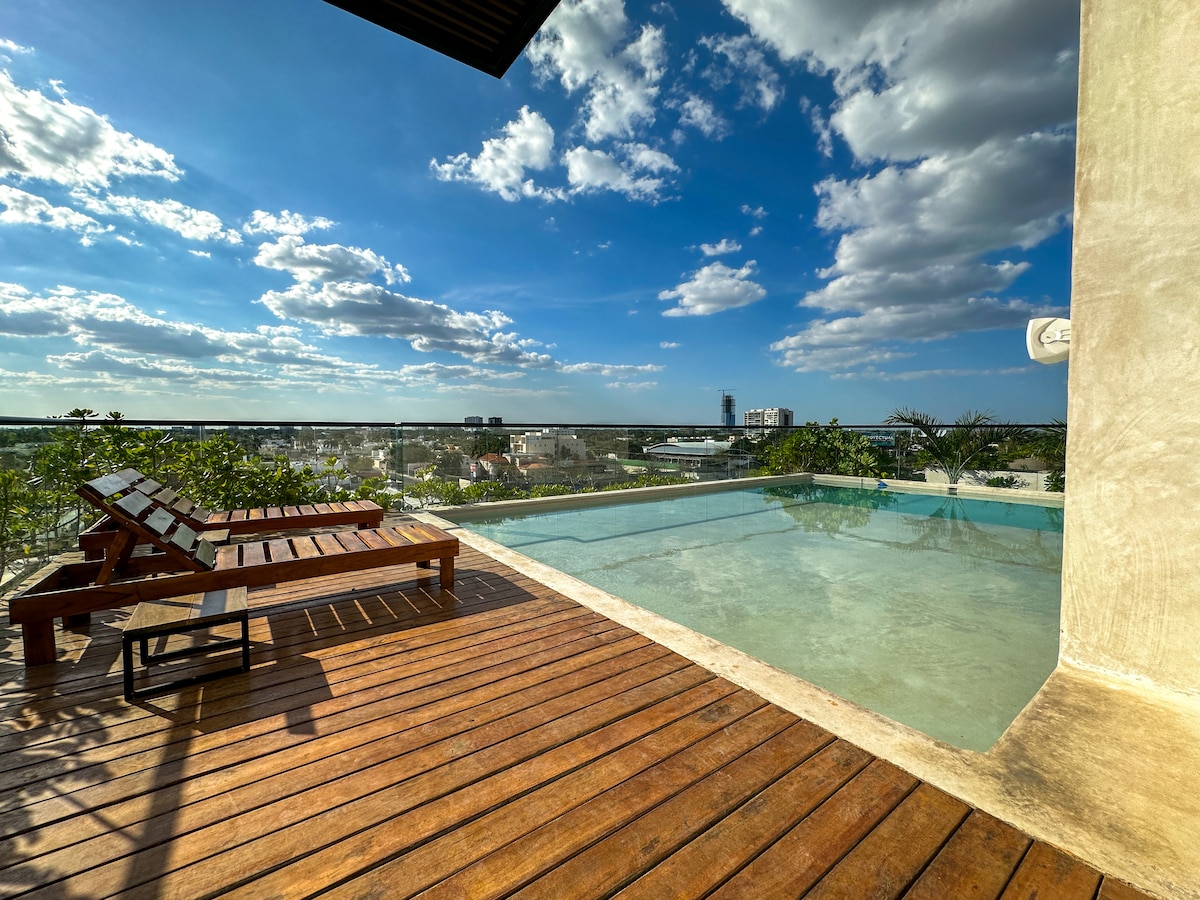 Beautiful apartment with an unbeatable location just one block from famous García Lavín Ave in the north of Mérida, where you will enjoy restaurants, the best nightlife area, gyms, supermarkets, shopping centers, and more. At Makou Apartments (Estudio R27A), you will experience a completely cozy and fresh atmosphere. Additionally, experience living in a building with unique design and amenities including a serviced bar, swimming pool, barbecue area, rooftop, and more. Equipped for long stays.