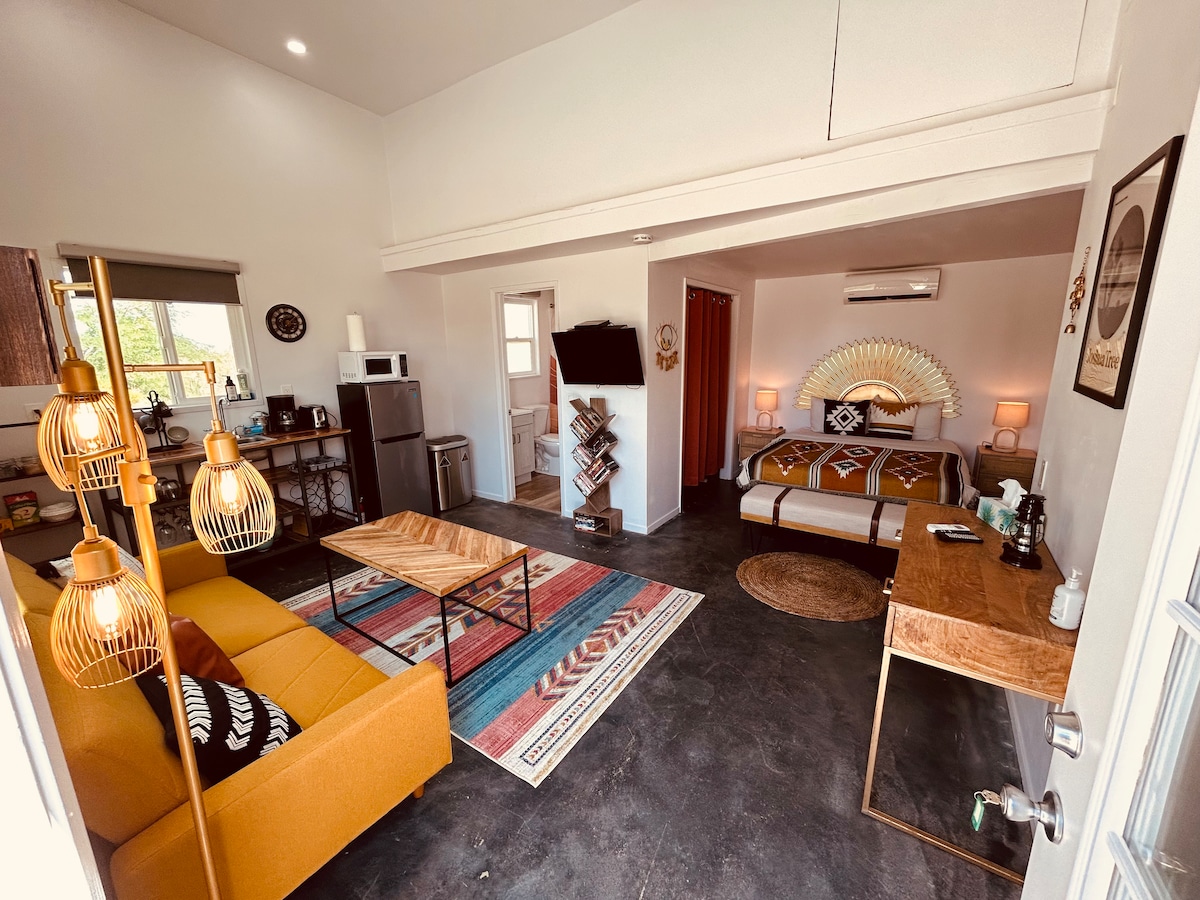 Our guest home is located behind the main house in the beautiful neighborhood of Western Hills Estates, we are located near Joshua Tree National Park and Pioneer Town. Our guest home is fully furnished to make your stay comfortable, including a kitchenette with mini fridge, hot plate, and microwave. Enjoy the amazing sunrise, sunsets and views over Yucca Valley and Joshua Tree from this hill top retreat. Please note we do allow dogs with an extra $30 fee.