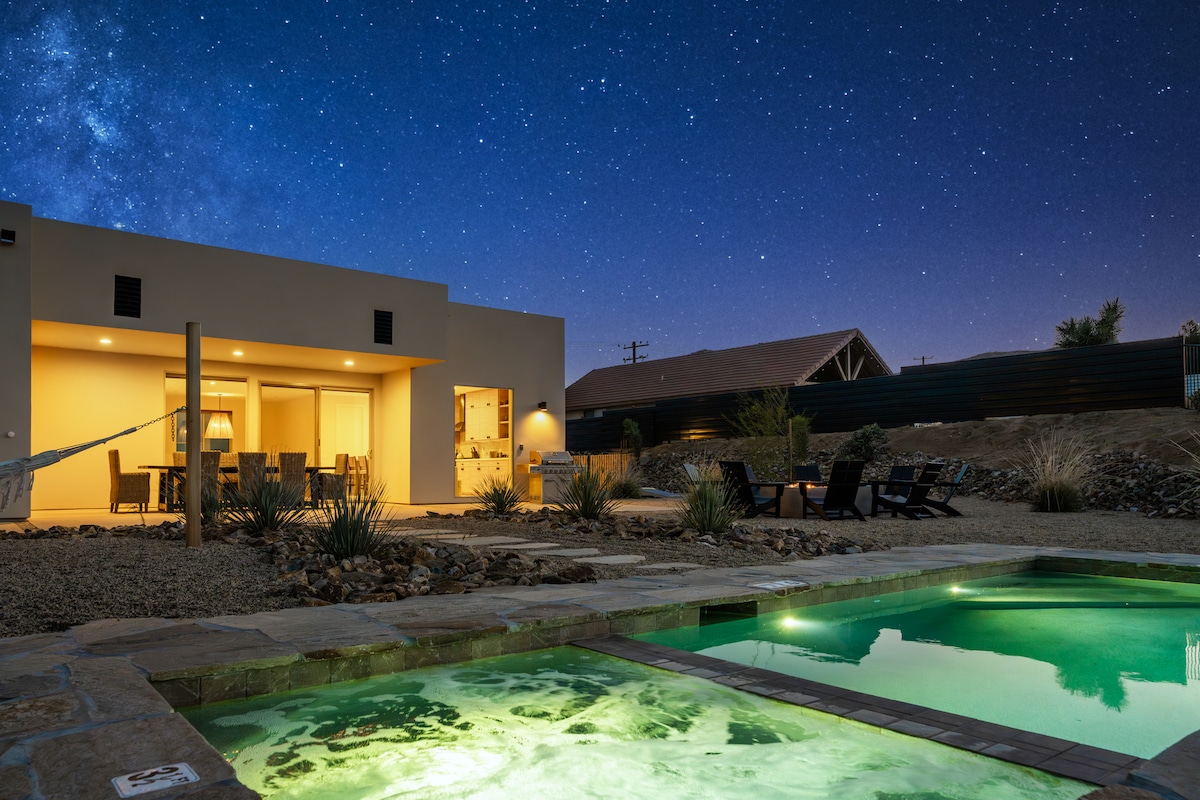 Immerse yourself in this newly built luxurious 3 bedroom, 2 Bath home, featuring expansive windows that unveil the breathtaking landscapes, a sparkling heated pool and spa for starlit dips, and a dedicated fitness space. Unwind under endless skies on 2 sprawling acres in your own private oasis, perfect for stargazing and patio gatherings. Wake up to breathtaking sunrises, explore Joshua Tree's otherworldly wonders, then return for a rejuvenating soak in your desert haven.