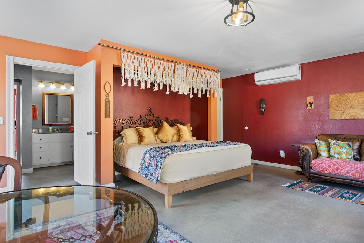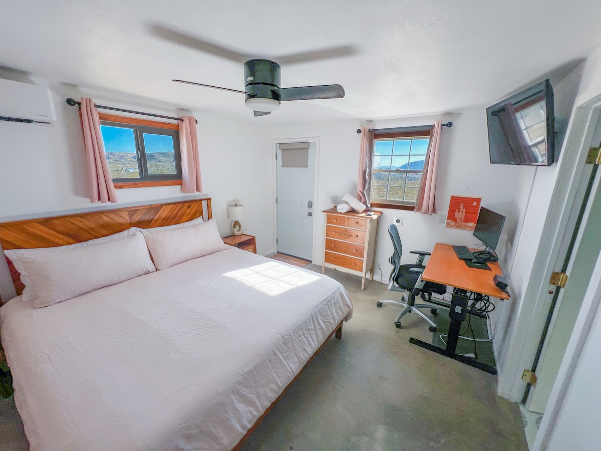 8.2 miles from JTNP Wake up to sweeping vistas of sunlit desert hills and gorgeous sunsets. Kitchenette adjacent to the bedroom, with cafe table for quick meals. And large dining table in the living room for lingering dinners. Enjoy your morning coffee on the private patio, soak up the sun, or stargaze under crystal-clear night skies. Upon booking, you will receive our Online Guest Guide, which highlights our favorite places to eat, drink, hike, making your stay genuinely unforgettable.
