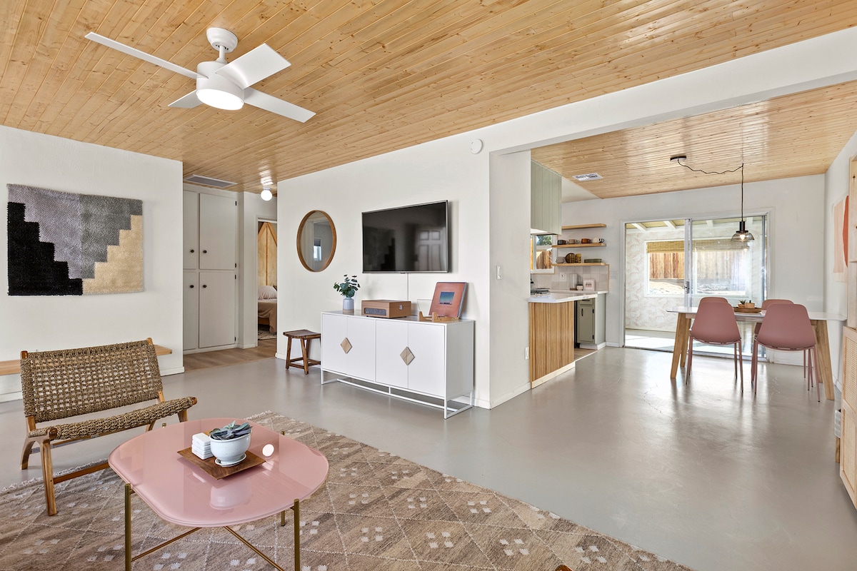 Our ranch style, light-filled, 1960’s peaceful home has panoramic views across hundreds of acres of untouched desert. We designed & created this relaxing space for ourselves so it isn’t a typical airbnb. :) Feel like you're a million miles a way in this secluded retreat while still having quick access to everything in the area: Just 10 minutes to the dining and shopping in Yucca Valley or Joshua Tree. And only 15 minutes to the main Joshua Tree Park entrance or Pioneertown.⚡️ Pets Welcome!