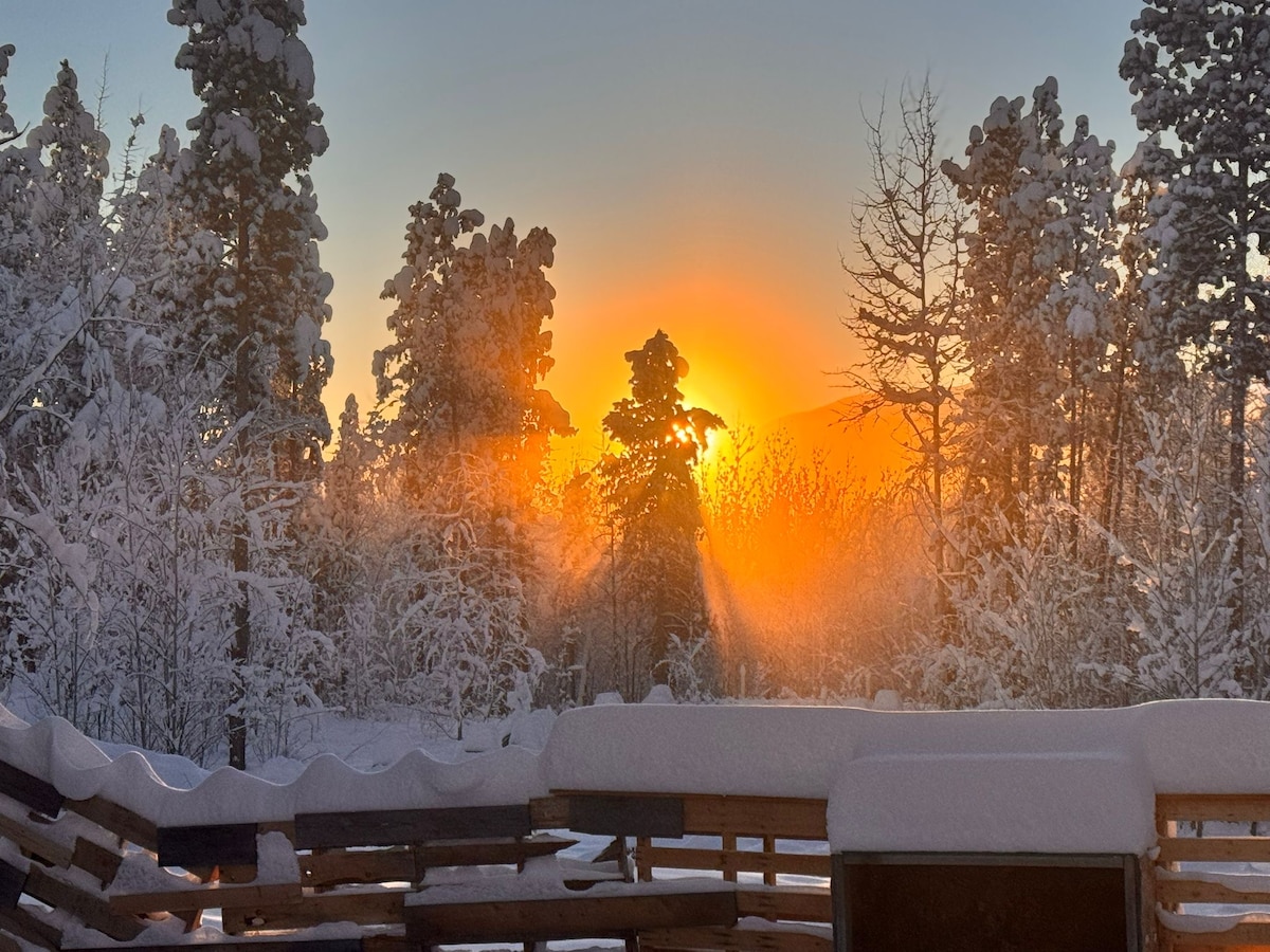 Experience the warmth and charm of our custom timber-frame guesthouse, nestled in a peaceful country-residential neighbourhood. Enjoy the serenity of the Yukon wilderness from your private deck, complete with breathtaking mountain views. The back deck is bathed in sunlight from late morning until sunset — perfect for relaxing, reading, or soaking in the natural beauty.