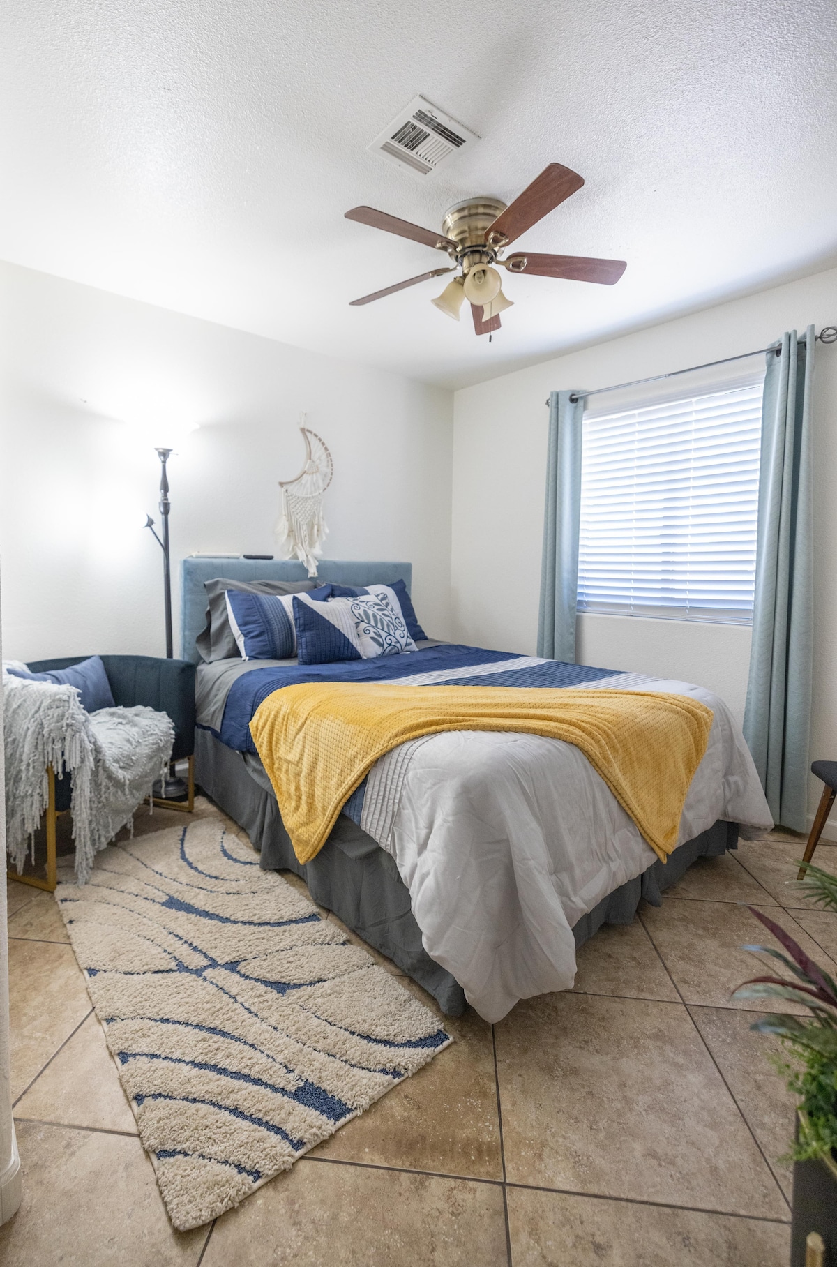 This is a single-story townhouse is centrally located in Yuma, with beautiful views and everything you need to make your stay comfortable. This Clean, comfortable and modern two-bedroom, two-bathroom townhouse sleeps six. It includes a fully-equipped kitchen with new appliances and granite counter tops. The living room comes with a queen sofa sleeper. A private furnished patio comes with a BBQ grill. There is a community pool just outside the front door.