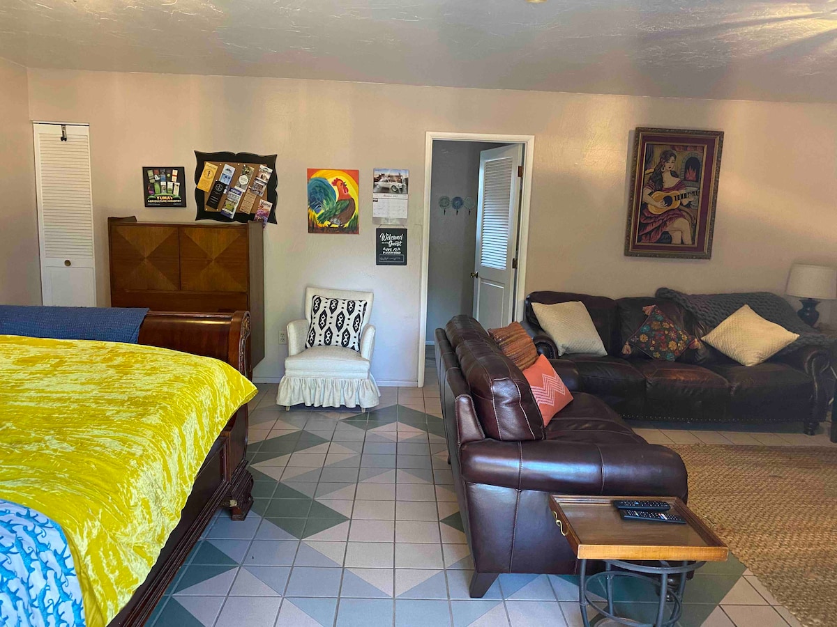 Our Southwestern-styled guesthouse is a private studio apartment complete with a kitchen and bathroom. We have a comfortable queen-sized bed. Our quiet guesthouse has great access to the interstate and is an easy five minute drive from most Yuma attractions (the Colorado river, quaint coffee shops, shopping, great restaurants, and movie theater in Old Town Yuma) The tile floor and fenced in backyard make it an ideal spot for those traveling with pets.