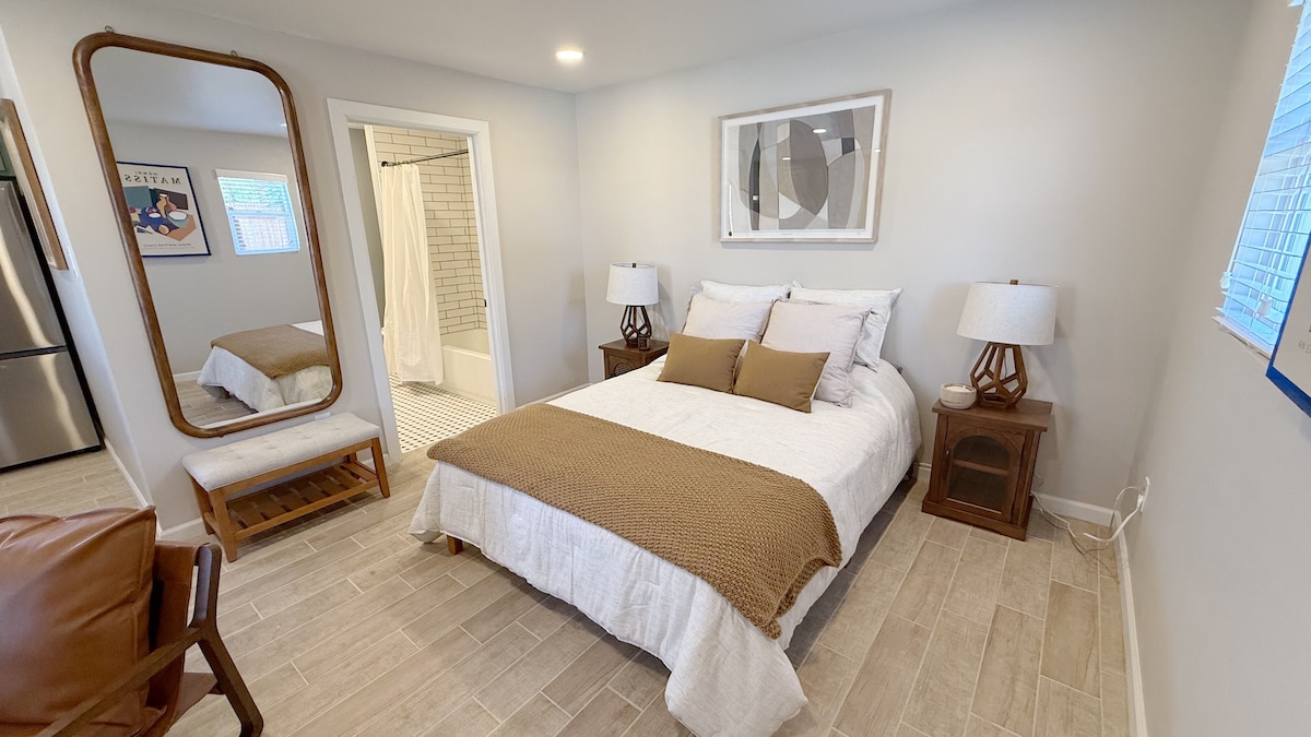 Welcome to our cozy studio – perfect for solo travelers or couples! Enjoy a beautiful, thoughtfully designed space with a smart TV, Keurig coffee maker, hot plate, and a partial but well-equipped kitchen for light cooking. You’ll also have your own washer and dryer for added convenience. Whether you're here to relax or explore, this studio is the perfect home base. Clean, comfortable, and ready for your stay!
