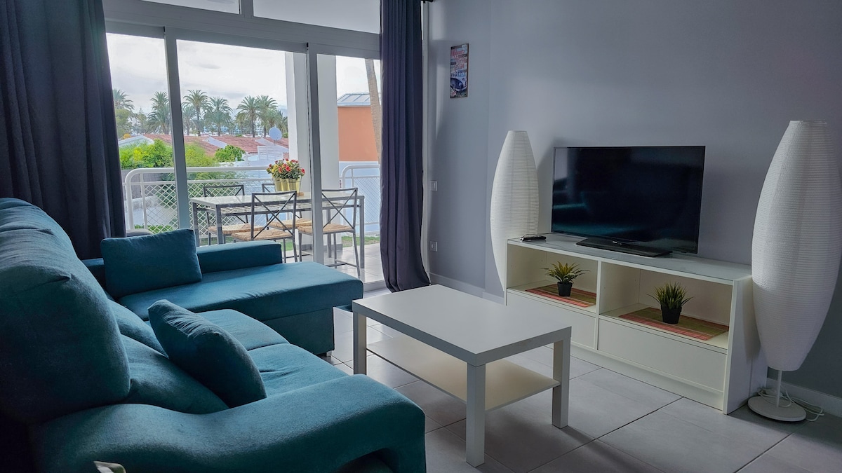 Beautiful, modern completely renovated apartment with one bedroom, one living room with full equipped kitchen and a nice balcony ( pool view). Two quiet Air-conditions Free high speed fiber Wi-Fi & good work place. Washing-machine. 500 meters to the beautiful Maspalomas beach, Across the street, big supermarket & super close to Yumbo center (5 min by foot). A wonderful roof terrace (mountain and seaview) where you can relax and sunbath with or without clothes (The elevator takes you easly up)