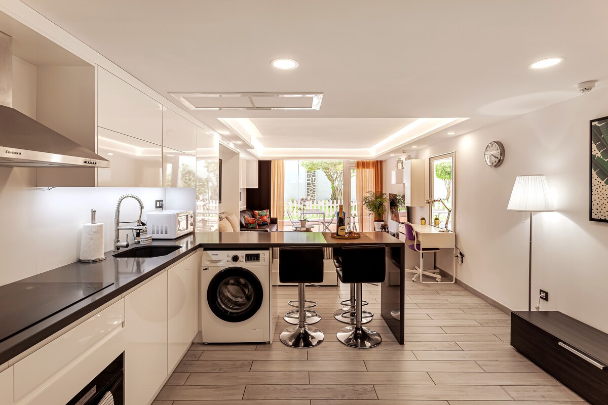 In the heart of Playa del Inglés. Absolutely central and yet full of privacy! A 2 minutes walk to the CITA, in max 10 minutes in the dunes (RIU Palace entrance) or the beach of Playa Del Ingles and a little walk of fame to the YUMBO. And yet quiet and absolutely private thanks to the enormous surrounding terrace. Sunny AND shady places to relax from sunrise to sunset. NEW in 2023: Home Office Space