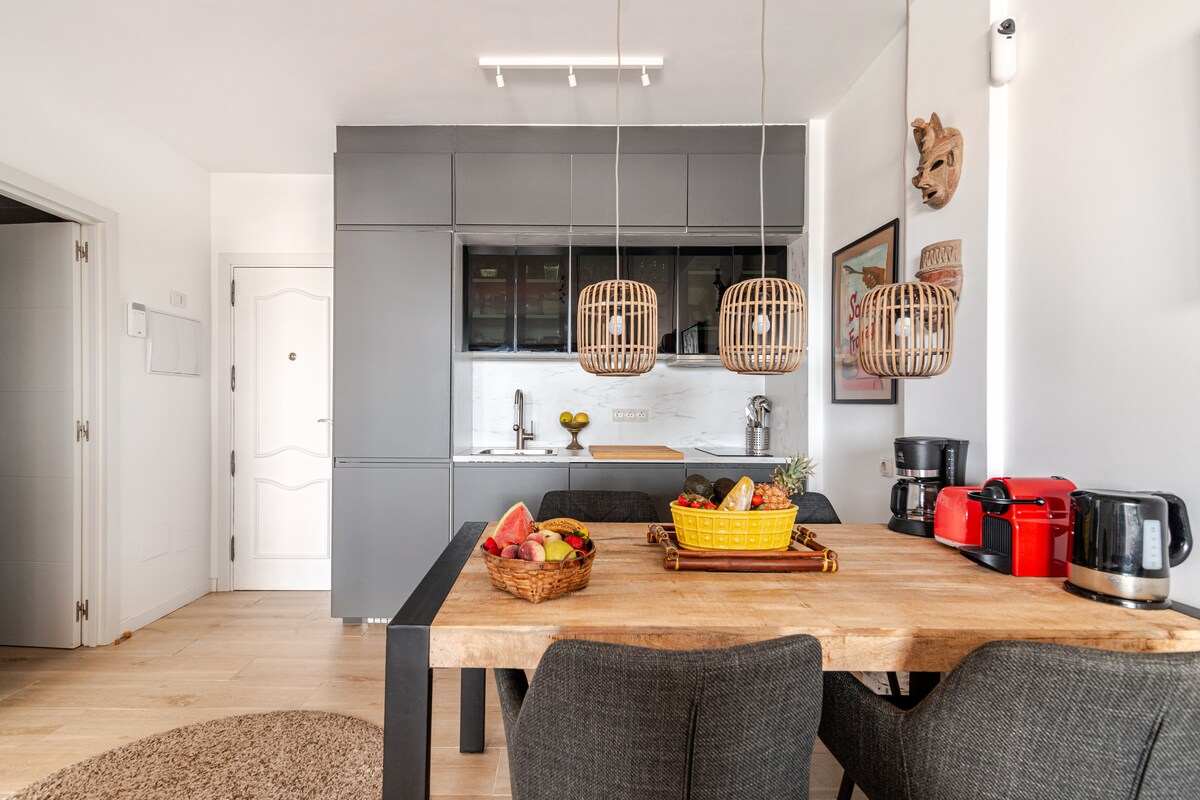 EL APARTAMENTO: Dos dormitorios con dos camas cada uno, con armarios incluidos, salón central con dos sofás-camas de 1.80 mts. Terraza cubierta con mesa y cuatro sillas. Baño completo con ducha y secador de pelo. WiFi gratuita. Smart-TV, cocina con vitrocerámica, lavaplatos, microondas, lavadora, nevera con congelador independiente y pequeños electrodomésticos. LIMITACIONES: Segundo piso sin ascensor. No habilitado para silla de ruedas. No se permite fumar dentro del apartamento