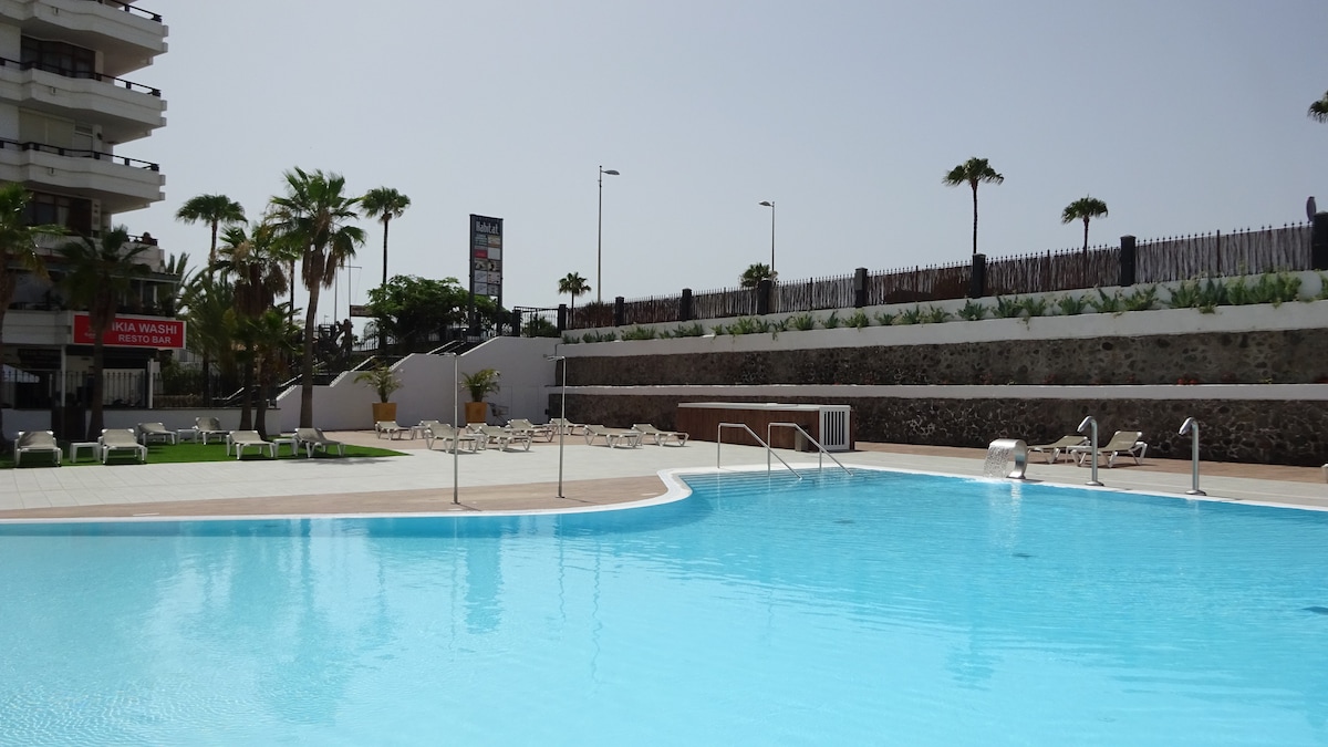 A pocos pasos de la playa, apartamento reformado, luminoso y totalmente equipado. Con buena orientación, es amplio, fresco y cómodo para estancias largas. Tiene terraza con vistas a la piscina, dos camas tipo hotel de 1 x 2 m, sofá cama, cocina con horno y microondas, wifi y dos Smart TV. Complejo con piscina, jardín y parking, cerca del C.C. Kasbah, Yumbo y Águila Roja, supermercados y buenas conexiones en bus y taxi. Ideal para caminar junto al mar, nadar, tomar el sol y explorar la isla.