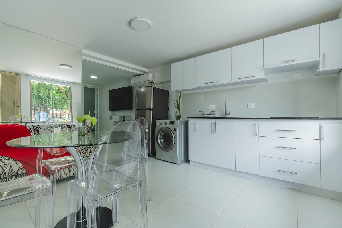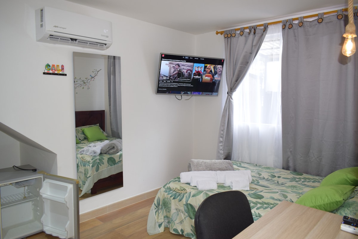Tiny Studio on the ground floor with bathroom, A/C, kitchen, and Fast Wi-Fi. Located in the north of Cali, close to Valle del Pacífico Convention Center, Orquideorama, the Boulevard del Río, and the airport. Nearest public transport, just 2 blocks from VIPASA MIO STATION and supermarkets, and 3 blocks from a lively dining area. You’ll enjoy a comfortable, quiet space with a good location.