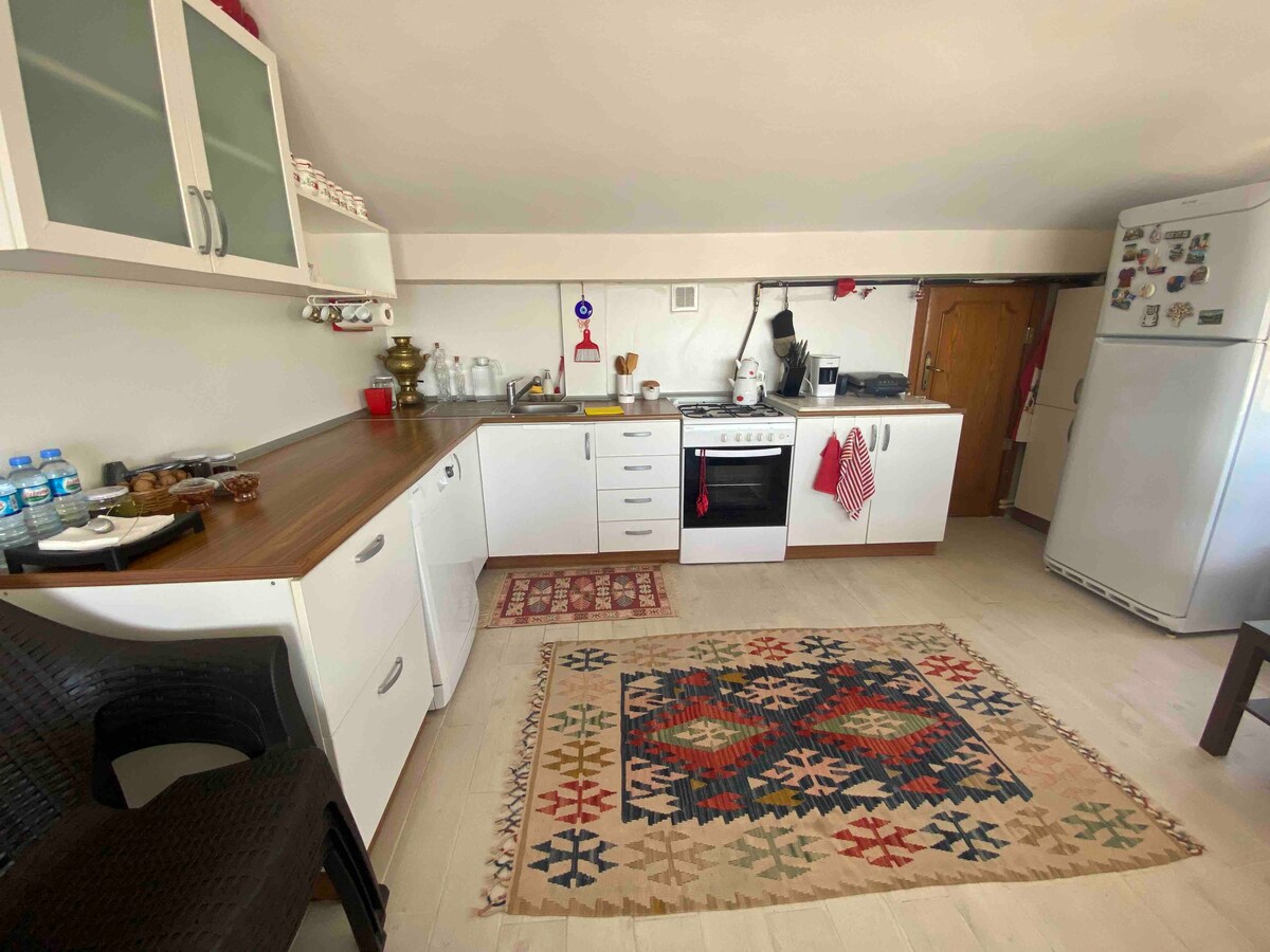 (🎶 a mansion that feels like winter garden) We are on a beautiful island, Heybeliada =) It’s 150 years old island house, Mansion of Hristo Nikolaidis. It has beautiful sunrise lights in the morning and it takes 2-3 min. to the house from centre by walking. It has a beautiful balcony with great seaview. There is natural gas, so warm at winter. I have a cat at home, Luna, so friendly. Kitchen has everything you need for cooking with 2 windows and also seaview. 🐿