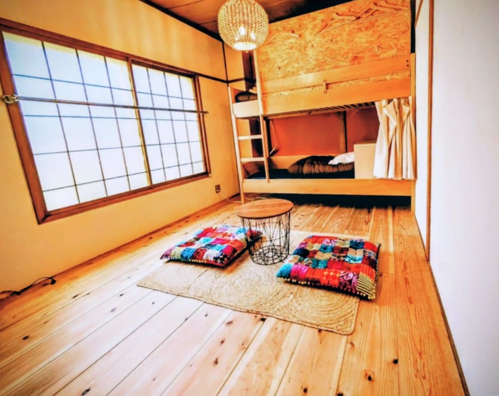 Rooms 3–6 are compact dormitory-style rooms arranged along the lodge’s iconic spiral staircase. Each room faces a different direction, offering unique views of Nozawa Onsen Village from various angles. Perfect for guests who enjoy discovering a new perspective with every visit. These are affordable, cozy options for solo travelers or small groups. For 1–4 guests. Shared kitchen, shower, and toilet. No air conditioning. Pets not allowed.