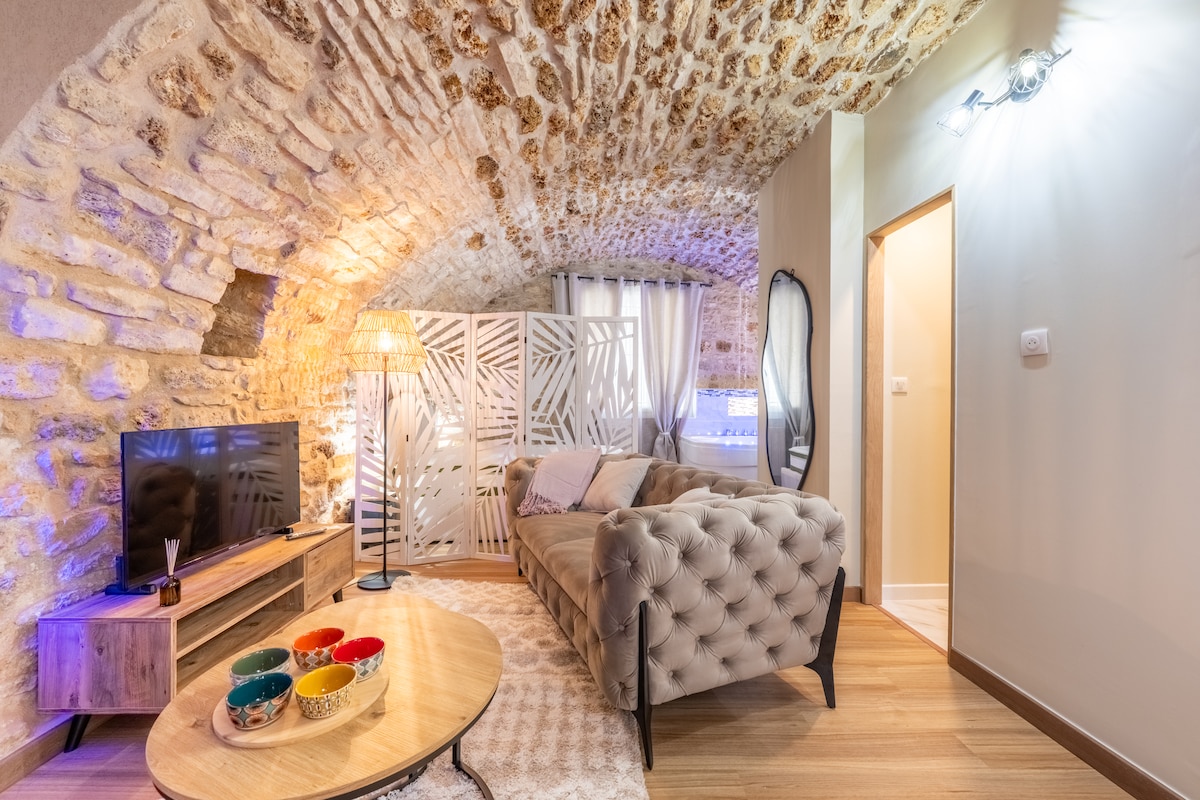 Offrez-vous une parenthèse hors du temps dans ce studio voûté en pierre, entièrement rénové et décoré avec soin. Pensé pour le confort et la détente, il dispose d’une balnéo privative, d’un lit confortable et d’une ambiance chaleureuse. Situé à 40 minutes de Paris, ce logement est parfait pour un week-end en amoureux, une escapade romantique ou un séjour bien-être. Alliant authenticité des pierres apparentes et équipements modernes, ce cocon offre une expérience unique et reposante..