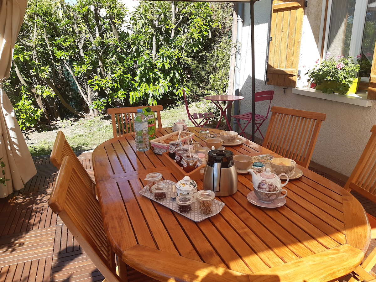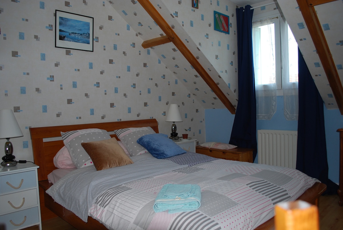 Grande chambre climatisé avec un lit double, un lit simple et un lit bébé. Une salle de bain avec baignoire et wc indépendant. Coin salon télé avec un lit simple en supplément de 20€ si besoin, le tout situé au premier étage d'une maison individuelle (étage réservé exclusivement aux voyageurs). Possibilité de petits déjeuners en supplément : 8euros/pers, servi à la table des hôtes. Repas possible sur demande. Stationnement facile dans la rue devant la maison.