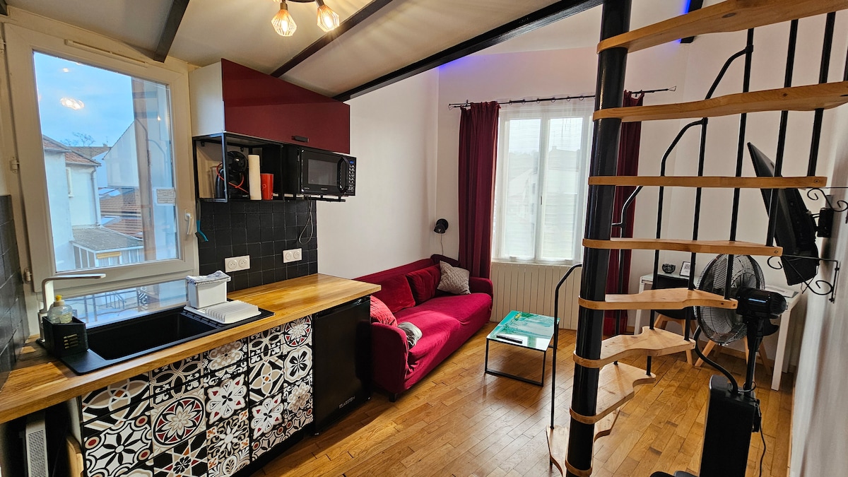 ❤️ PROMO with garden share We make with you the check in ! Iindependent Loft'Appart, free wifi / bright, quiet and cosy, ceiling 4.50m Near station metro line 1 and Rer A -armchairs and sofa -dining room: table, 5 chairs -equipped kitchenette -bathroom: 1 whirlpool bath/1 Italian shower: jets + rain shower, separate toilet -large mezzanine bed -TV screen 3x4 bluetooth Nearby: shops and restaurants and La Défense15' from Champs Elysées/U Arena/LVMH Museum/ Bois de Boulogne, Porte de Versailles