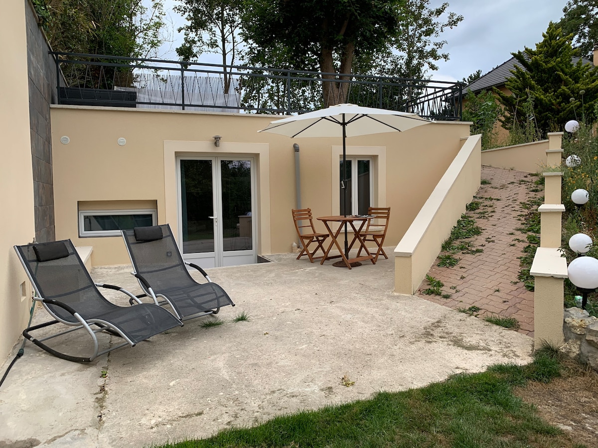 Studio 26 m2 with small kitchen + bathroom shower with WC , private access, private residence. Washing machine and dryer 2 terrasses 2 exposures, garden 800 m2, quiet and wooded spaces - at the foot of Port Royal forest, Vallée de Chevreuse (regional national park), hiking paths - mall 4 min walking - golf national 3,4 km - swimming pool with tobogans 1 km, - leisure park 6 km - train station SQY à 10 min - Versailles 10 km-10 min/Rambouillet 24 km - castle and center - Paris 25 km