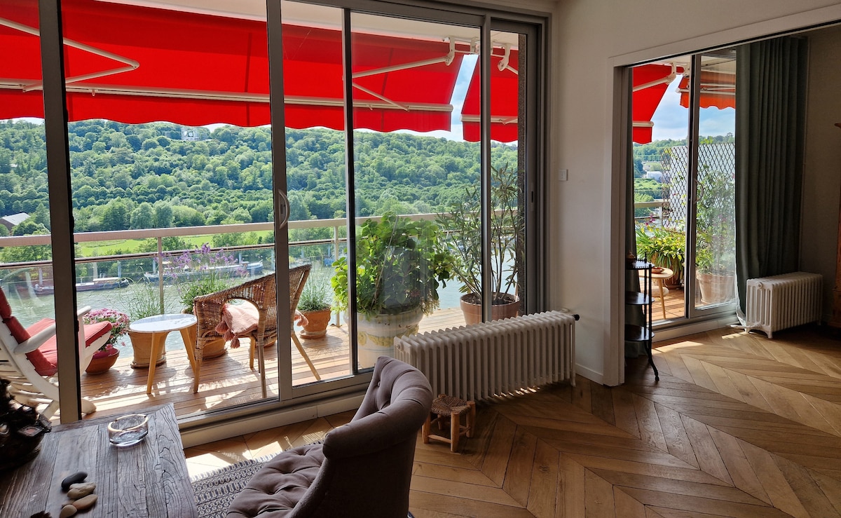 LA VIE SAGE is an entire luxurious house on a private island on the Seine river to enjoy absolute calm in the heart of nature, only 25 minutes from Paris. ACCESSIBLE ONLY BY BOAT. The house has 2 bedrooms, 2 bathrooms, a large living room with an open kitchen and a chimney, a garden and an 80m2 terrace equipped with a hot tub and sauna to admire the dazzling sunsets over the Seine. The house is fully equipped: underfloor heating, air conditioning, kitchen, WIFI, TV, connected lights.